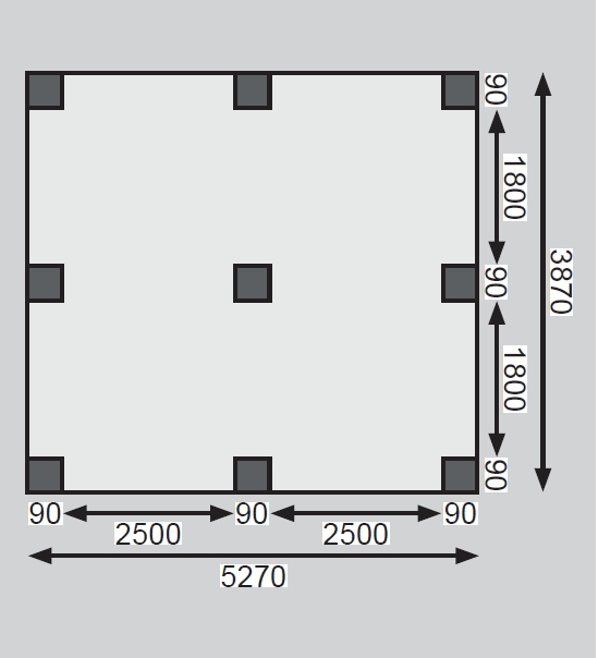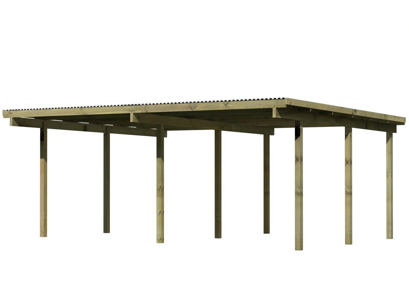 Přístřešek má obdélníkový tvar a svými rozměry vyhovuje většině modelů vozidel běžných na českém trhu. Celková zastřešená plocha je 5,63 x 4,90 m. Průjezdná výška je 206 cm. Střechu podpírá devět dřevěných sloupků 9 x 9 cm. Konstrukce přístřešku je tlakově impregnována a je tak dobře chráněna proti dřevokazným houbám i hmyzu, ale i proti nepříznivým povětrnostním podmínkám. Impregnace je zdravotně nezávadná a naprosto bezpečná. Vzhledem k velkým plochám střechy a zatížení větrem je nutné připevnit přístřešek k zemi pomocí odpovídajících zemních kotev (nejsou obsahem dodávky - lze dokoupit jako příplatkové příslušenství).