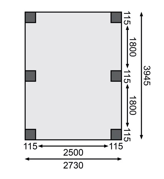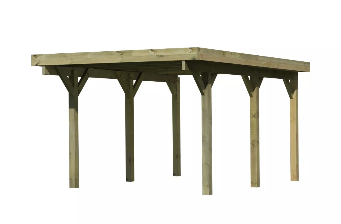 Přístřešek na auto - obdélníkový tvar a svými rozměry vyhovuje většině modelů vozidel běžných na českém trhu. Celková zastřešená plocha je 3,18 x 4,80 m. Průjezdná výška je 206 cm. Střechu podpírá šest dřevěných sloupků 11,5 x 11,5 cm. Konstrukce přístřešku je tlakově impregnována a je tak dobře chráněna proti dřevokazným houbám i hmyzu, ale i proti nepříznivým povětrnostním podmínkám. Impregnace je zdravotně nezávadná a naprosto bezpečná. Vzhledem k velkým plochám střechy a zatížení větrem je nutné připevnit přístřešek k zemi pomocí odpovídajících zemních kotev (nejsou obsahem dodávky - lze dokoupit jako příplatkové příslušenství).