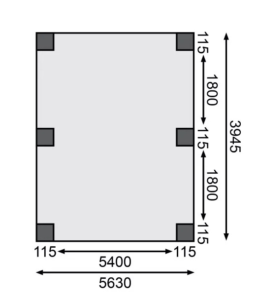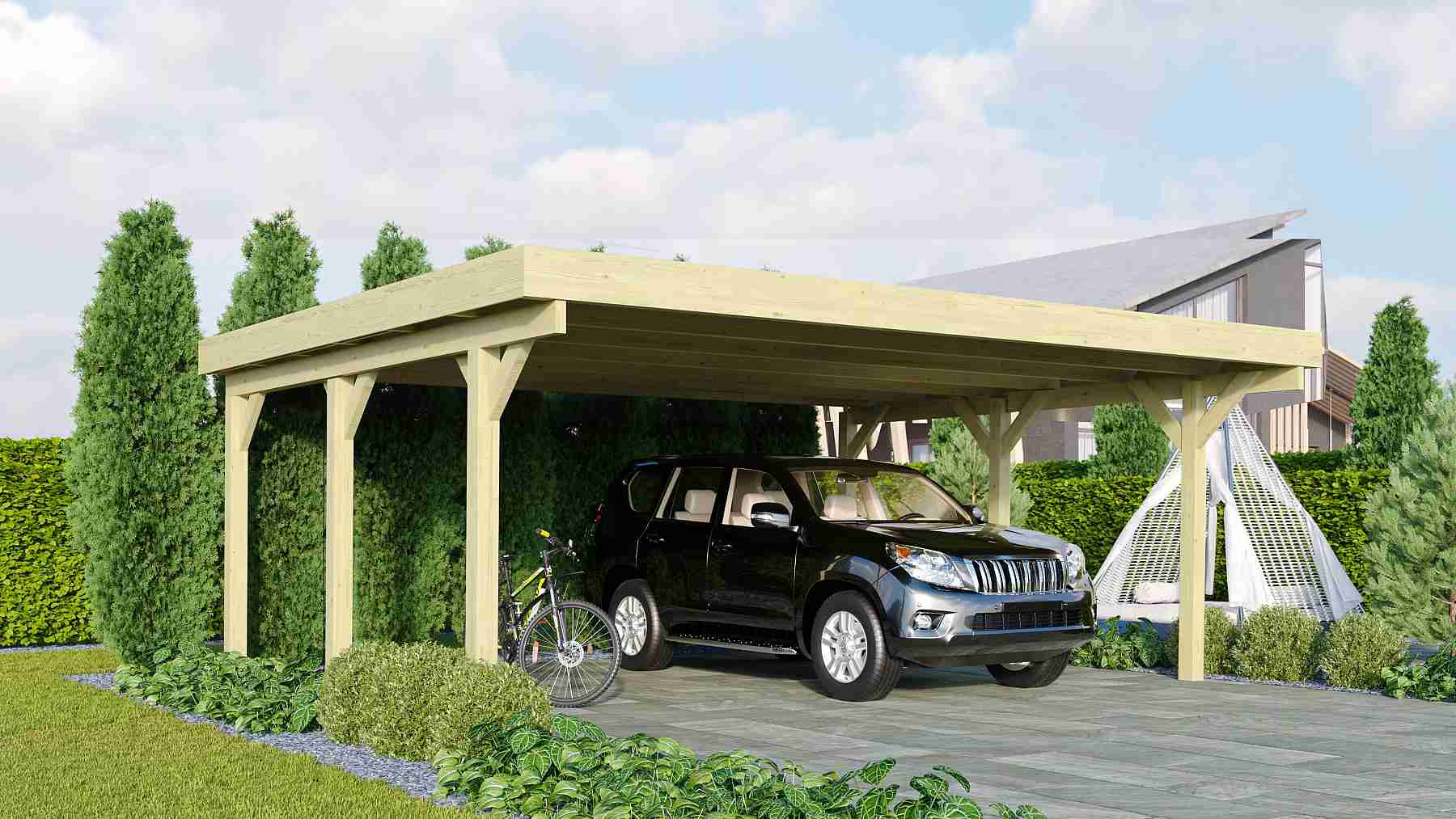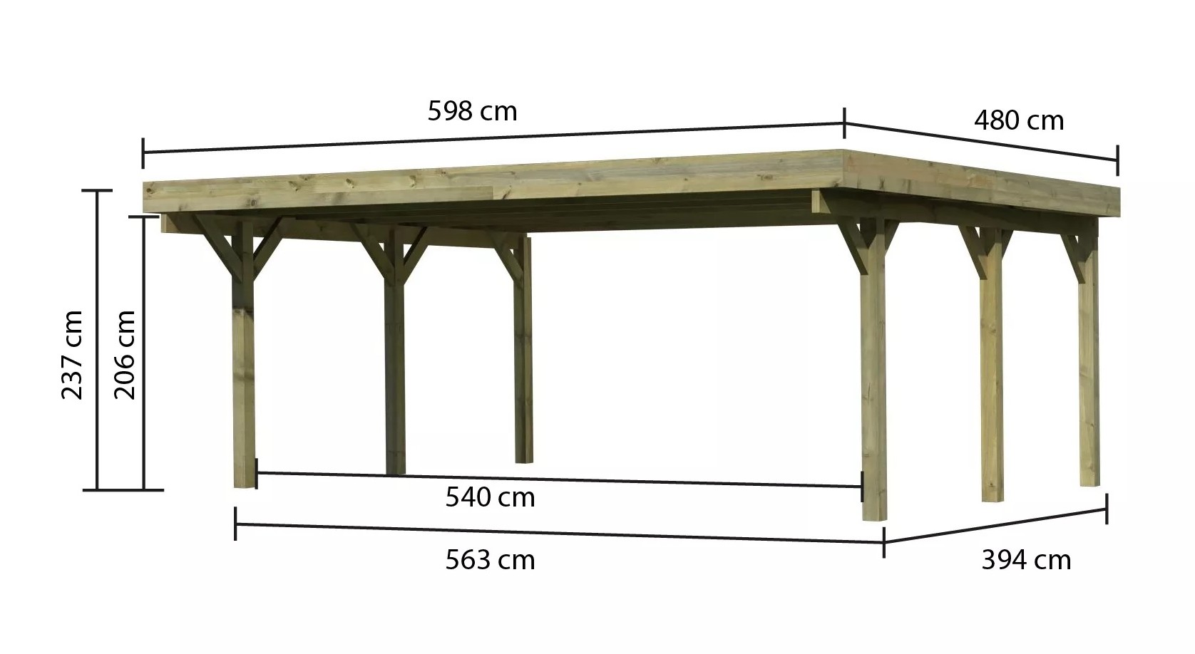 Přístřešek na auto - obdélníkový tvar a svými rozměry vyhovuje většině modelů vozidel běžných na českém trhu. Celková zastřešená plocha je 5,98 x 4,80 m. Průjezdná výška je 206 cm. Střechu podpírá šest dřevěných sloupků 11,5 x 11,5 cm. Konstrukce přístřešku je tlakově impregnována a je tak dobře chráněna proti dřevokazným houbám i hmyzu, ale i proti nepříznivým povětrnostním podmínkám. Impregnace je zdravotně nezávadná a naprosto bezpečná. Vzhledem k velkým plochám střechy a zatížení větrem je nutné připevnit přístřešek k zemi pomocí odpovídajících zemních kotev (nejsou obsahem dodávky - lze dokoupit jako příplatkové příslušenství).