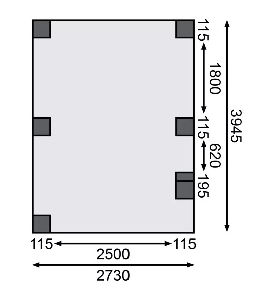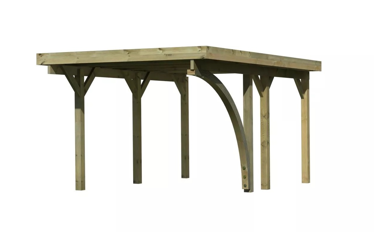 Přístřešek na auto - obdélníkový tvar a svými rozměry vyhovuje většině modelů vozidel běžných na českém trhu. Celková zastřešená plocha je 3,18 x 4,80 m. Průjezdná výška je 206 cm. Střechu podpírá šest dřevěných sloupků 11,5 x 11,5 cm. Konstrukce přístřešku je tlakově impregnována a je tak dobře chráněna proti dřevokazným houbám i hmyzu, ale i proti nepříznivým povětrnostním podmínkám. Impregnace je zdravotně nezávadná a naprosto bezpečná. Vzhledem k velkým plochám střechy a zatížení větrem je nutné připevnit přístřešek k zemi pomocí odpovídajících zemních kotev (nejsou obsahem dodávky - lze dokoupit jako příplatkové příslušenství).