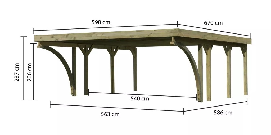 Přístřešek na auto - obdélníkový tvar a svými rozměry vyhovuje většině modelů vozidel běžných na českém trhu. Celková zastřešená plocha je 5,98 x 6,70 m. Průjezdná výška je 206 cm. Střechu podpírá osm dřevěných sloupků 11,5 x 11,5 cm. Konstrukce přístřešku je tlakově impregnována a je tak dobře chráněna proti dřevokazným houbám i hmyzu, ale i proti nepříznivým povětrnostním podmínkám. Impregnace je zdravotně nezávadná a naprosto bezpečná. Vzhledem k velkým plochám střechy a zatížení větrem je nutné připevnit přístřešek k zemi pomocí odpovídajících zemních kotev (nejsou obsahem dodávky - lze dokoupit jako příplatkové příslušenství).