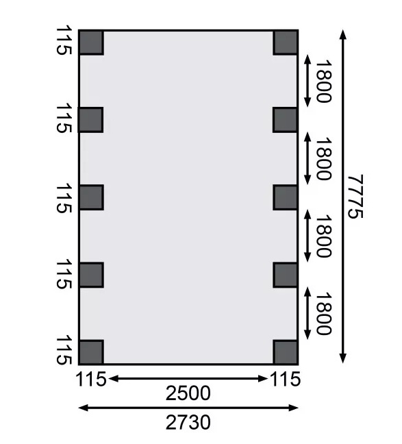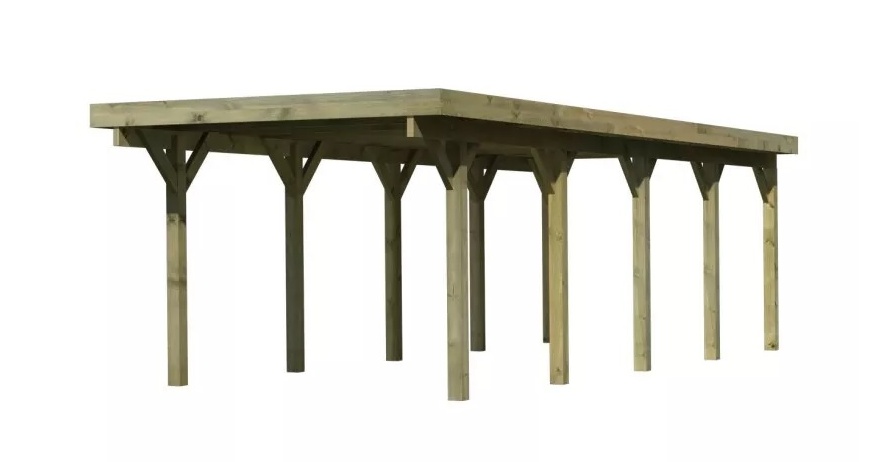 Přístřešek na auto - obdélníkový tvar a svými rozměry vyhovuje většině modelů vozidel běžných na českém trhu. Celková zastřešená plocha je 3,18 x 8,60 m. Průjezdná výška je 206 cm. Střechu podpírá deset dřevěných sloupků 11,5 x 11,5 cm. Konstrukce přístřešku je tlakově impregnována a je tak dobře chráněna proti dřevokazným houbám i hmyzu, ale i proti nepříznivým povětrnostním podmínkám. Impregnace je zdravotně nezávadná a naprosto bezpečná. Vzhledem k velkým plochám střechy a zatížení větrem je nutné připevnit přístřešek k zemi pomocí odpovídajících zemních kotev (nejsou obsahem dodávky - lze dokoupit jako příplatkové příslušenství).