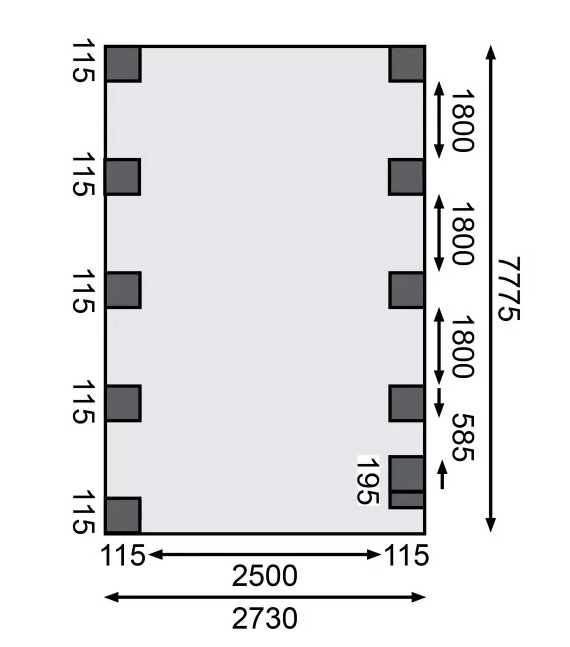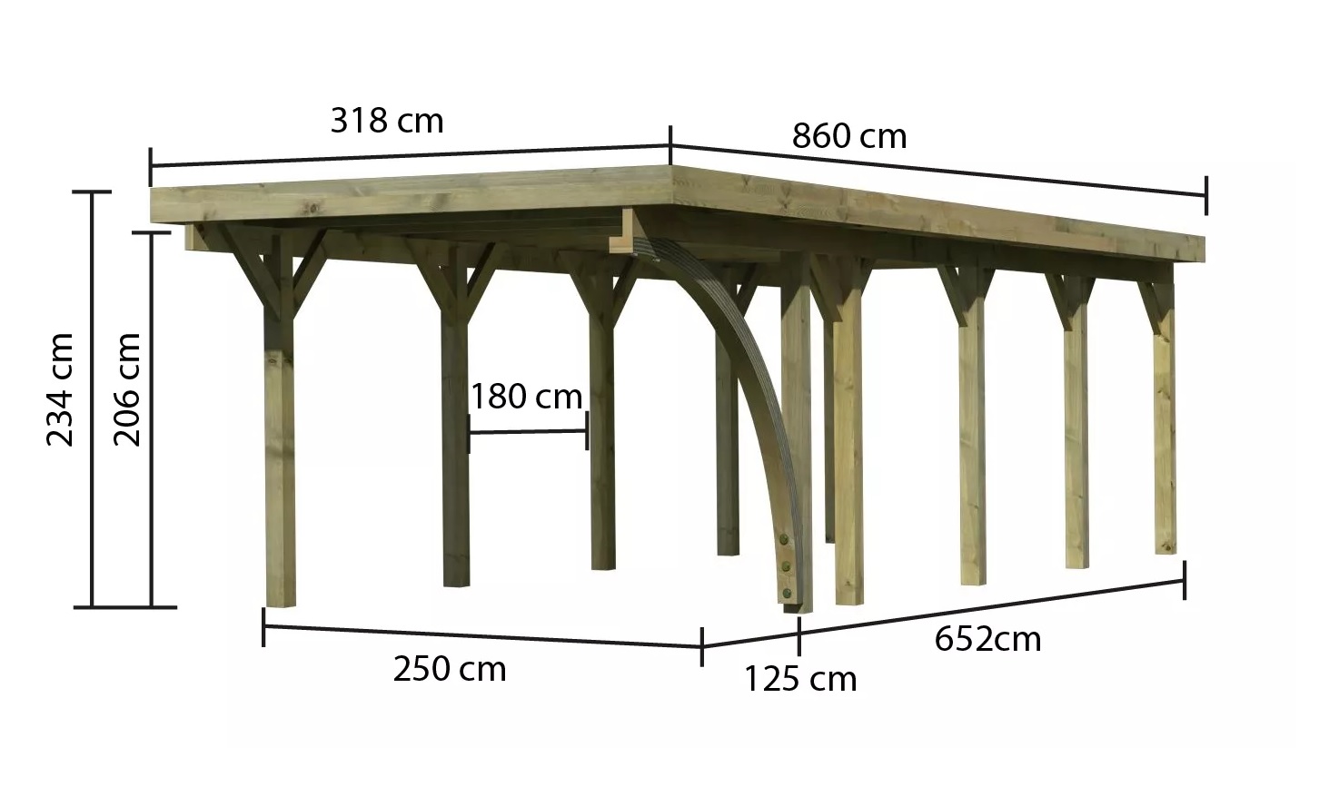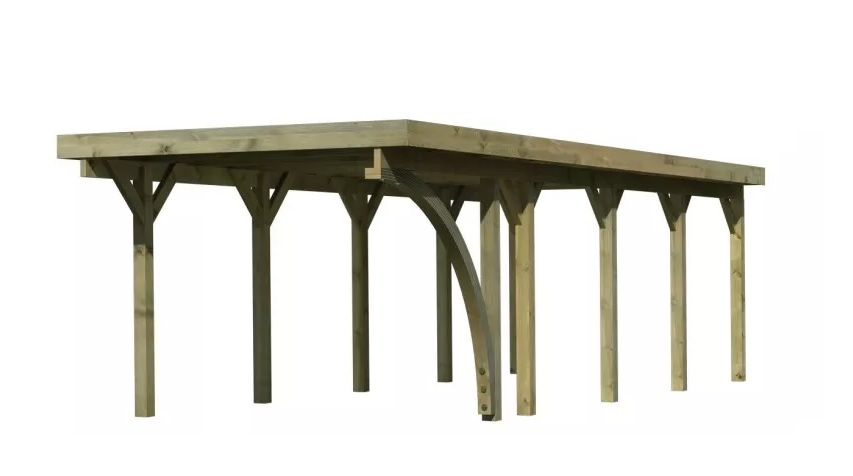 Přístřešek na auto - obdélníkový tvar a svými rozměry vyhovuje většině modelů vozidel běžných na českém trhu. Celková zastřešená plocha je 3,18 x 8,60 m. Průjezdná výška je 206 cm. Střechu podpírá deset dřevěných sloupků 11,5 x 11,5 cm. Konstrukce přístřešku je tlakově impregnována a je tak dobře chráněna proti dřevokazným houbám i hmyzu, ale i proti nepříznivým povětrnostním podmínkám. Impregnace je zdravotně nezávadná a naprosto bezpečná. Vzhledem k velkým plochám střechy a zatížení větrem je nutné připevnit přístřešek k zemi pomocí odpovídajících zemních kotev (nejsou obsahem dodávky - lze dokoupit jako příplatkové příslušenství).