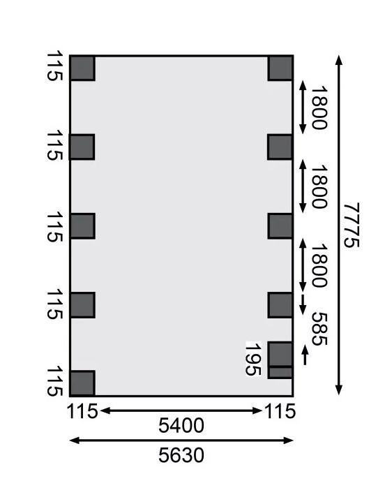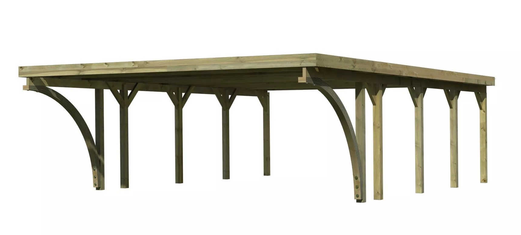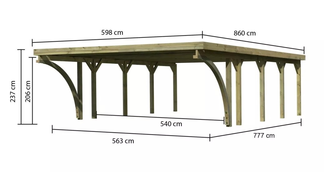 Přístřešek na auto - obdélníkový tvar a svými rozměry vyhovuje většině modelů vozidel běžných na českém trhu. Celková zastřešená plocha je 5,98 x 8,60 m. Průjezdná výška je 206 cm. Střechu podpírá deset dřevěných sloupků 11,5 x 11,5 cm. Konstrukce přístřešku je tlakově impregnována a je tak dobře chráněna proti dřevokazným houbám i hmyzu, ale i proti nepříznivým povětrnostním podmínkám. Impregnace je zdravotně nezávadná a naprosto bezpečná. Vzhledem k velkým plochám střechy a zatížení větrem je nutné připevnit přístřešek k zemi pomocí odpovídajících zemních kotev (nejsou obsahem dodávky - lze dokoupit jako příplatkové příslušenství).