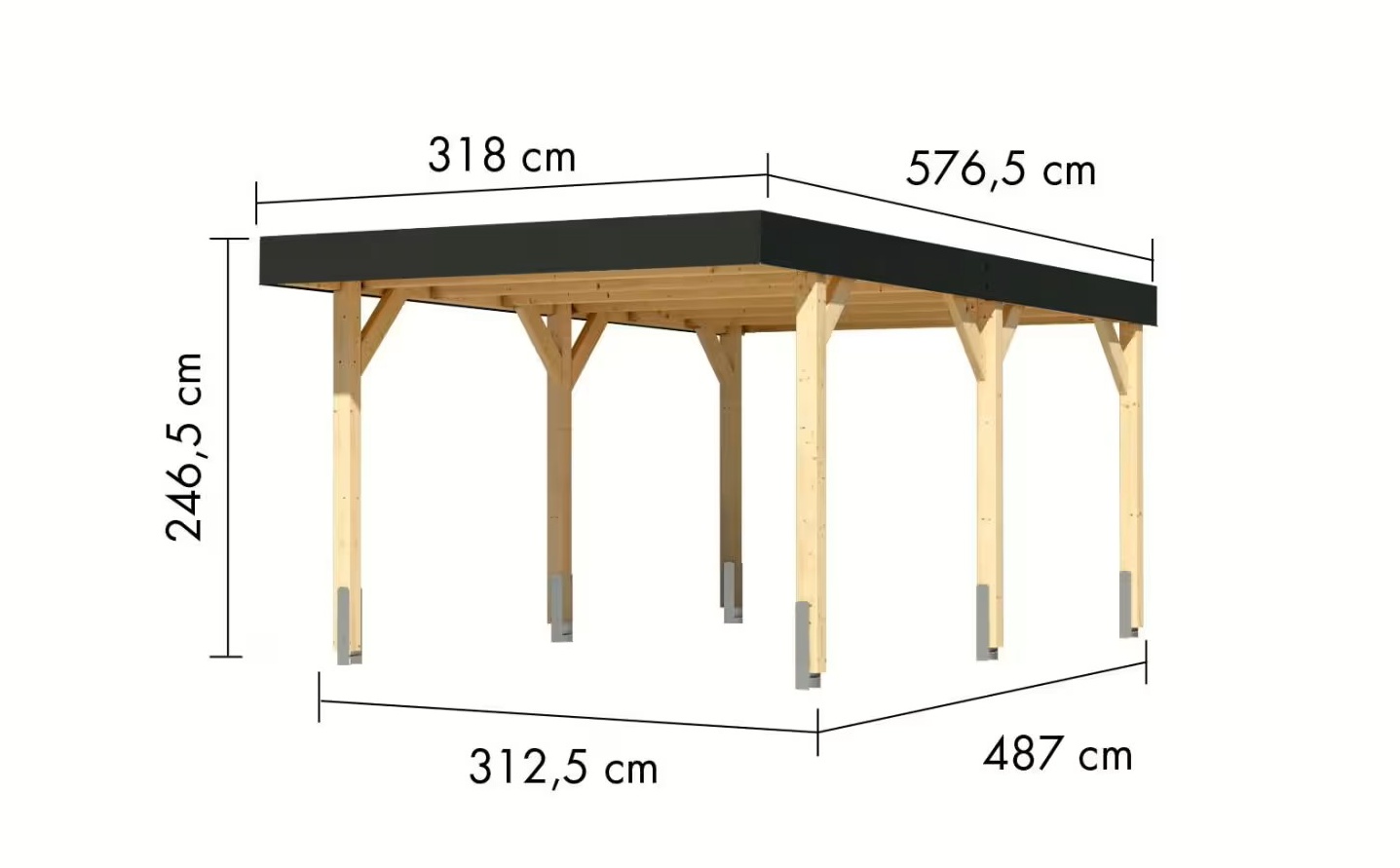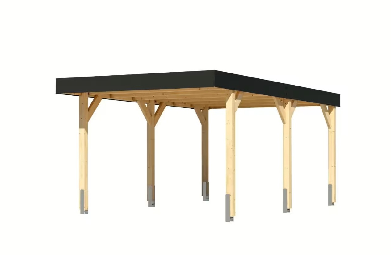 Přístřešek má obdélníkový tvar a svými rozměry vyhovuje většině modelů vozidel běžných na českém trhu. Celková zastřešená plocha je 3,18 x 5,76 m. Díky průjezdné výšce 212 cm je vhodný i pro vyšší automobily a SUV. Střechu podpírá šest robustních sloupků 12 x 12 cm. Celá konstrukce je vyrobena z vysoce kvalitního lepeného smrkového dřeva, které vyniká mimořádnou odolností vůči nepříznivým povětrnostním vlivům. Střešní konstrukce je dimenzována na sněhovou zátěž 140 kg/m2. Vzhledem k velké ploše střechy a zatížení větrem je nutné přístřešek bezpečně ukotvit k zemi pomocí vhodných zemních kotev (nejsou součástí dodávky, lze je dokoupit jako příslušenství).