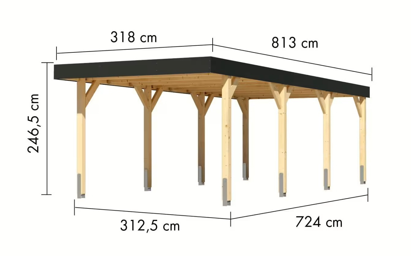 Přístřešek má obdélníkový tvar a svými rozměry vyhovuje většině modelů vozidel běžných na českém trhu. Celková zastřešená plocha je 3,18 x 8,13 m. Díky průjezdné výšce 212 cm je vhodný i pro vyšší automobily a SUV. Střechu podpírá osm robustních sloupků 12 x 12 cm. Celá konstrukce je vyrobena z vysoce kvalitního lepeného smrkového dřeva, které vyniká mimořádnou odolností vůči nepříznivým povětrnostním vlivům. Střešní konstrukce je dimenzována na sněhovou zátěž 140 kg/m2. Vzhledem k velké ploše střechy a zatížení větrem je nutné přístřešek bezpečně ukotvit k zemi pomocí vhodných zemních kotev (nejsou součástí dodávky, lze je dokoupit jako příslušenství).