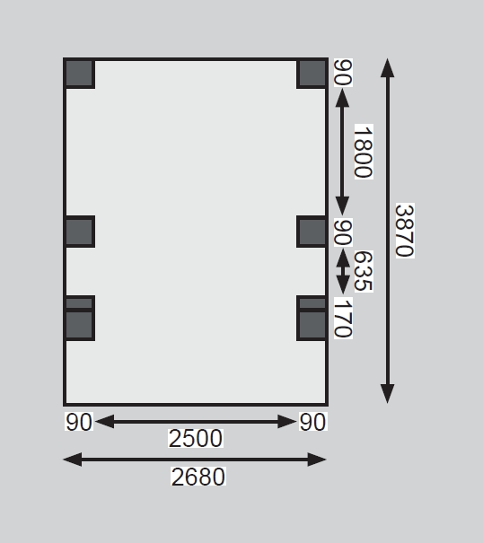 Přístřešek na auto - obdélníkový tvar a svými rozměry vyhovuje řadě modelů vozidel běžných na českém trhu (nutno ověřit velikost vozu). Celková zastřešená plocha je 3,04 x 4,90 m. Průjezdná výška je 206 cm. Střechu podpírá šest dřevěných sloupků 9 x 9 cm. Konstrukce přístřešku je tlakově impregnována a je tak dobře chráněna proti dřevokazným houbám i hmyzu, ale i proti nepříznivým povětrnostním podmínkám. Impregnace je zdravotně nezávadná a naprosto bezpečná. Vzhledem k velkým plochám střechy a zatížení větrem je nutné připevnit přístřešek k zemi pomocí odpovídajících zemních kotev (nejsou obsahem dodávky - lze dokoupit jako příplatkové příslušenství).