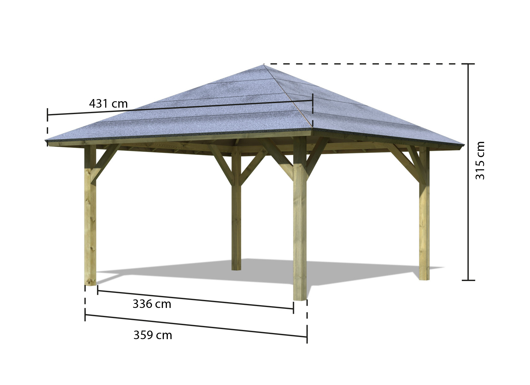 Přístřešek má obdélníkový tvar a svými rozměry vyhovuje většině modelů vozidel běžných na českém trhu. Celková zastřešená plocha je 4,31 x 4,31 m. Průjezdná výška je 196 cm. Střechu podpírají čtyři dřevěné sloupky 12 x 12 cm. Konstrukce přístřešku je tlakově impregnována a je tak dobře chráněna proti dřevokazným houbám i hmyzu, ale i proti nepříznivým povětrnostním podmínkám. Impregnace je zdravotně nezávadná a naprosto bezpečná. Vzhledem k velkým plochám střechy a zatížení větrem je nutné připevnit přístřešek k zemi pomocí odpovídajících zemních kotev (nejsou obsahem dodávky - lze dokoupit jako příplatkové příslušenství).