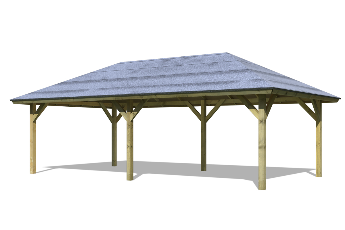 Přístřešek má obdélníkový tvar a svými rozměry vyhovuje většině modelů vozidel běžných na českém trhu. Celková zastřešená plocha je 4,31 x 7,78 m. Průjezdná výška je 196 cm. Střechu podpírá šest dřevěných sloupků 12 x 12 cm. Konstrukce přístřešku je tlakově impregnována a je tak dobře chráněna proti dřevokazným houbám i hmyzu, ale i proti nepříznivým povětrnostním podmínkám. Impregnace je zdravotně nezávadná a naprosto bezpečná. Vzhledem k velkým plochám střechy a zatížení větrem je nutné připevnit přístřešek k zemi pomocí odpovídajících zemních kotev (nejsou obsahem dodávky - lze dokoupit jako příplatkové příslušenství).