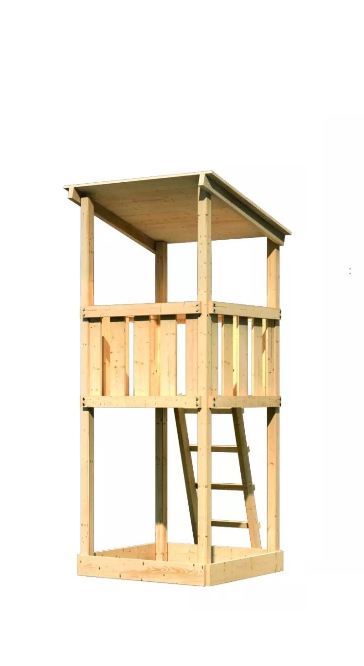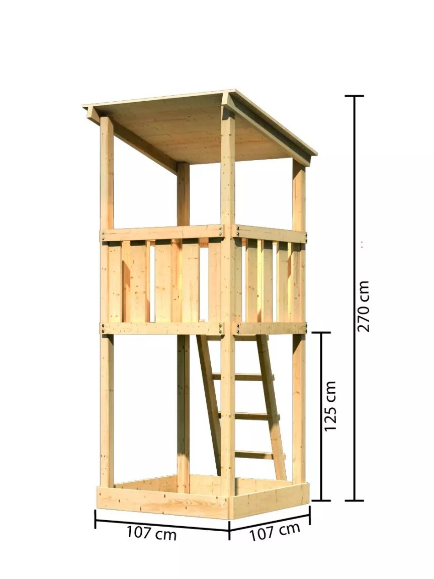 Dětské hřiště KARIBU ANNA poskytuje dětem spoustu možností ke hrám. Nabízí vše k tomu, aby děti mohly prožít veškeré své hrací fantazie. Stejně jako u všech našich dětských hřišť i u modelu KARIBU ANNA používáme výhradně to nejlepší smrkové dřevo. Hřiště má nosné sloupy o tloušťce 68 x 68 mm a je vyrobené z dřevěných profilů o síle 18 mm (spoje v systému pero / drážka). Naše dřevo pochází ze vzdáleného severu Evropy a je chemicky naprosto neošetřené. V důsledku toho je prosté všech známých problematických látek. Díky výšce plošiny 125 cm nabízí hřiště KARIBU ANNA dětem dokonalý výhled na zahradu. Hřiště je standardně vybaveno robustním dřevěným žebříkem se 4 příčkami a pískovištěm pod věží. Dětské hřiště KARIBU ANNA má samozřejmě certifikát TÜV Nord ověřující bezpečnost výrobku (GS) podle DIN EN 71-1, DIN EN 71-3, DIN EN 71-8 a AfPS GS 2014.