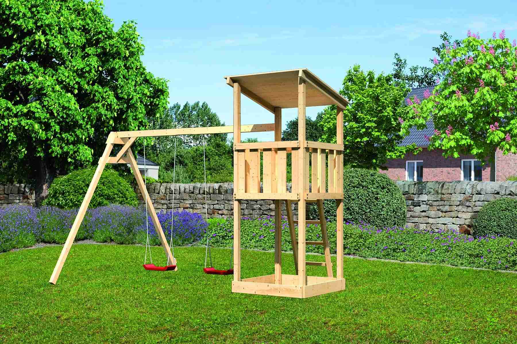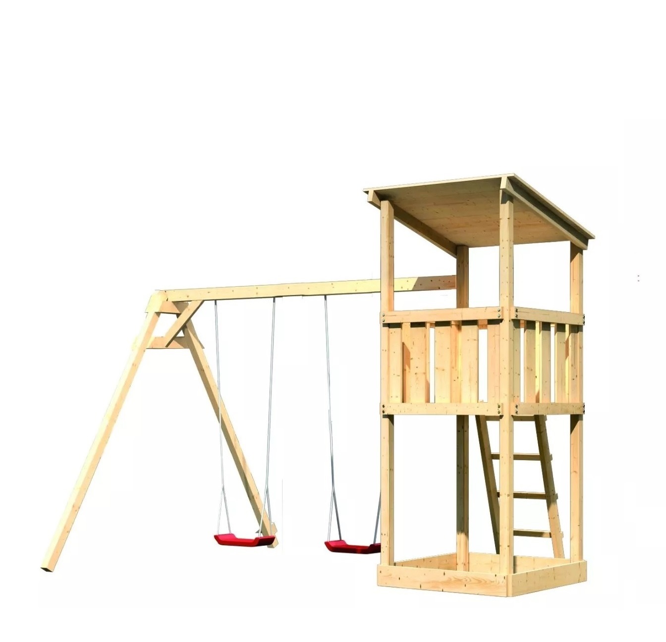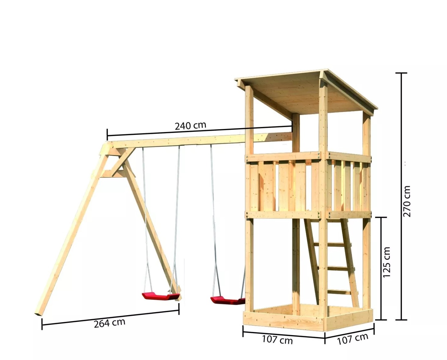 Dětské hřiště KARIBU ANNA poskytuje dětem spoustu možností ke hrám. Nabízí vše k tomu, aby děti mohly prožít veškeré své hrací fantazie. Stejně jako u všech našich dětských hřišť i u modelu KARIBU ANNA používáme výhradně to nejlepší smrkové dřevo. Hřiště má nosné sloupy o tloušťce 68 x 68 mm a je vyrobené z dřevěných profilů o síle 18 mm (spoje v systému pero / drážka). Naše dřevo pochází ze vzdáleného severu Evropy a je chemicky naprosto neošetřené. V důsledku toho je prosté všech známých problematických látek. Díky výšce plošiny 125 cm nabízí hřiště KARIBU ANNA dětem dokonalý výhled na zahradu. Hřiště je standardně vybaveno robustním dřevěným žebříkem se 4 příčkami a pískovištěm pod věží. Dětské hřiště KARIBU ANNA má samozřejmě certifikát TÜV Nord ověřující bezpečnost výrobku (GS) podle DIN EN 71-1, DIN EN 71-3, DIN EN 71-8 a AfPS GS 2014.