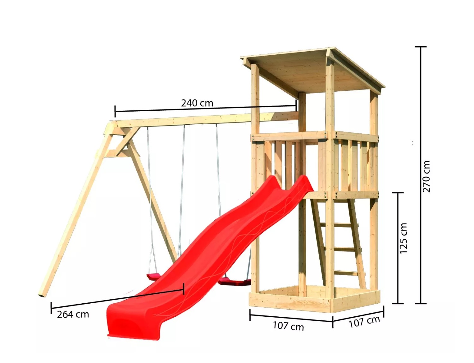 Dětské hřiště KARIBU ANNA poskytuje dětem spoustu možností ke hrám. Nabízí vše k tomu, aby děti mohly prožít veškeré své hrací fantazie. Stejně jako u všech našich dětských hřišť i u modelu KARIBU ANNA používáme výhradně to nejlepší smrkové dřevo. Hřiště má nosné sloupy o tloušťce 68 x 68 mm a je vyrobené z dřevěných profilů o síle 18 mm (spoje v systému pero / drážka). Naše dřevo pochází ze vzdáleného severu Evropy a je chemicky naprosto neošetřené. V důsledku toho je prosté všech známých problematických látek. Díky výšce plošiny 125 cm nabízí hřiště KARIBU ANNA dětem dokonalý výhled na zahradu. Hřiště je standardně vybaveno robustním dřevěným žebříkem se 4 příčkami a pískovištěm pod věží. Dětské hřiště KARIBU ANNA má samozřejmě certifikát TÜV Nord ověřující bezpečnost výrobku (GS) podle DIN EN 71-1, DIN EN 71-3, DIN EN 71-8 a AfPS GS 2014.