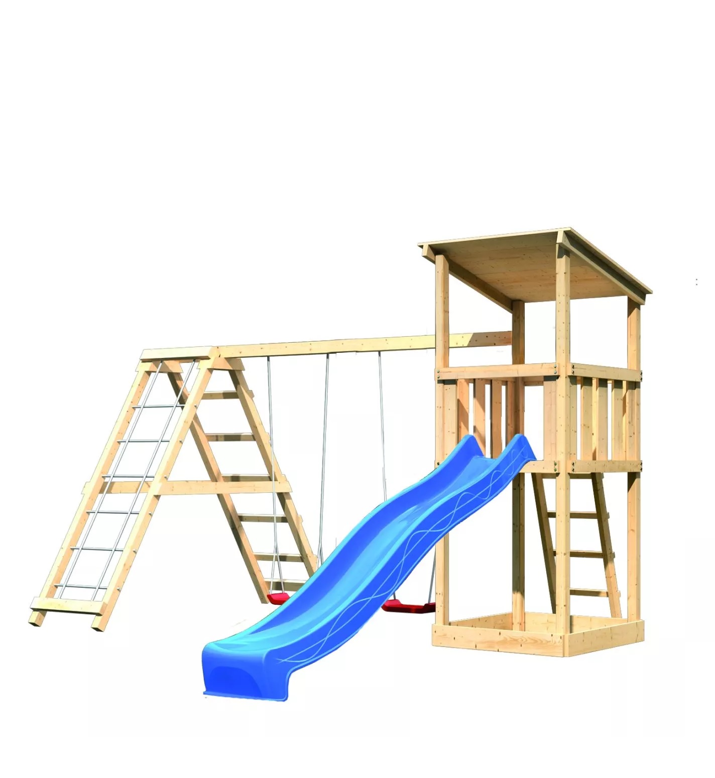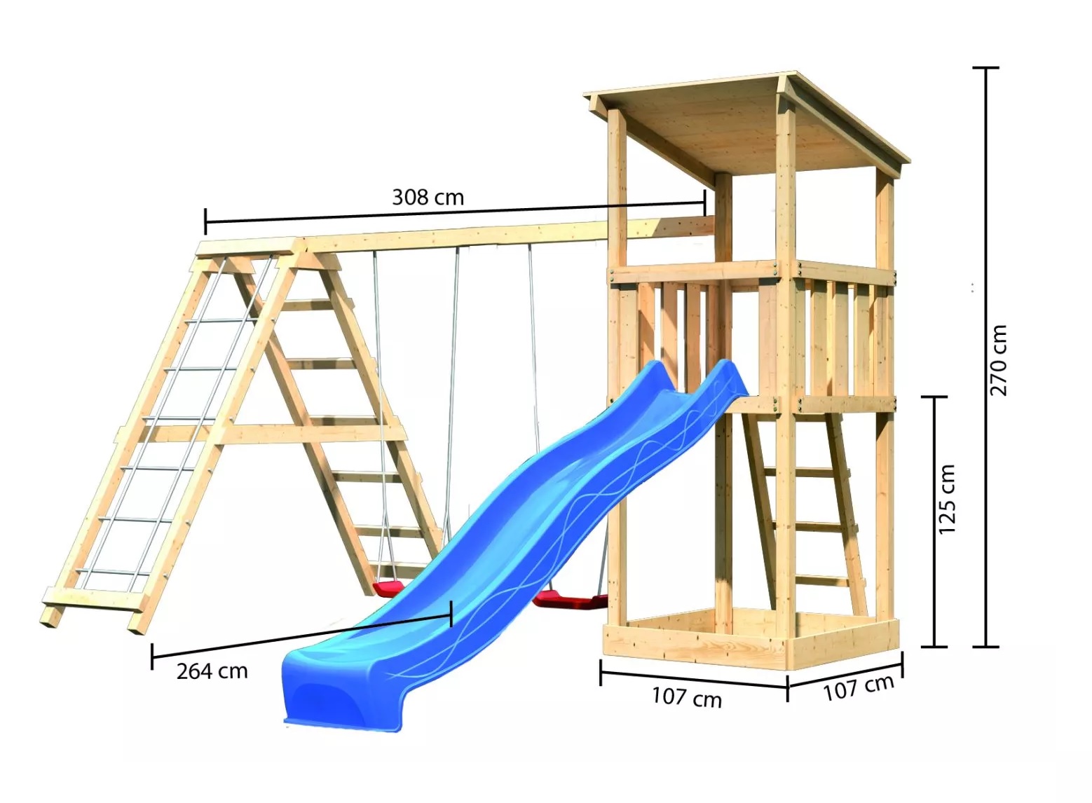 Dětské hřiště KARIBU ANNA poskytuje dětem spoustu možností ke hrám. Nabízí vše k tomu, aby děti mohly prožít veškeré své hrací fantazie. Stejně jako u všech našich dětských hřišť i u modelu KARIBU ANNA používáme výhradně to nejlepší smrkové dřevo. Hřiště má nosné sloupy o tloušťce 68 x 68 mm a je vyrobené z dřevěných profilů o síle 18 mm (spoje v systému pero / drážka). Naše dřevo pochází ze vzdáleného severu Evropy a je chemicky naprosto neošetřené. V důsledku toho je prosté všech známých problematických látek. Díky výšce plošiny 125 cm nabízí hřiště KARIBU ANNA dětem dokonalý výhled na zahradu. Hřiště je standardně vybaveno robustním dřevěným žebříkem se 4 příčkami a pískovištěm pod věží. Dětské hřiště KARIBU ANNA má samozřejmě certifikát TÜV Nord ověřující bezpečnost výrobku (GS) podle DIN EN 71-1, DIN EN 71-3, DIN EN 71-8 a AfPS GS 2014.