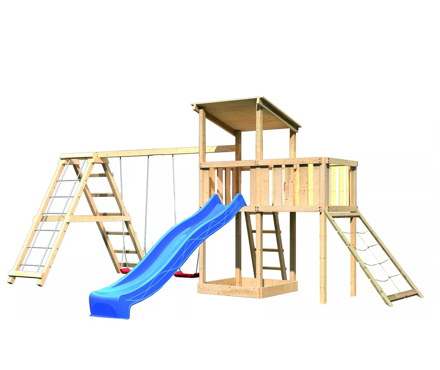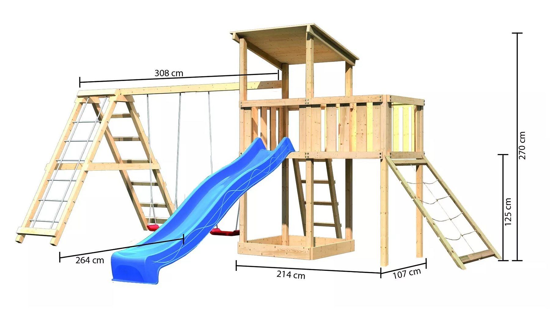 Dětské hřiště KARIBU ANNA poskytuje dětem spoustu možností ke hrám. Nabízí vše k tomu, aby děti mohly prožít veškeré své hrací fantazie. Stejně jako u všech našich dětských hřišť i u modelu KARIBU ANNA používáme výhradně to nejlepší smrkové dřevo. Hřiště má nosné sloupy o tloušťce 68 x 68 mm a je vyrobené z dřevěných profilů o síle 18 mm (spoje v systému pero / drážka). Naše dřevo pochází ze vzdáleného severu Evropy a je chemicky naprosto neošetřené. V důsledku toho je prosté všech známých problematických látek. Díky výšce plošiny 125 cm nabízí hřiště KARIBU ANNA dětem dokonalý výhled na zahradu. Hřiště je standardně vybaveno robustním dřevěným žebříkem se 4 příčkami a pískovištěm pod věží. Dětské hřiště KARIBU ANNA má samozřejmě certifikát TÜV Nord ověřující bezpečnost výrobku (GS) podle DIN EN 71-1, DIN EN 71-3, DIN EN 71-8 a AfPS GS 2014.