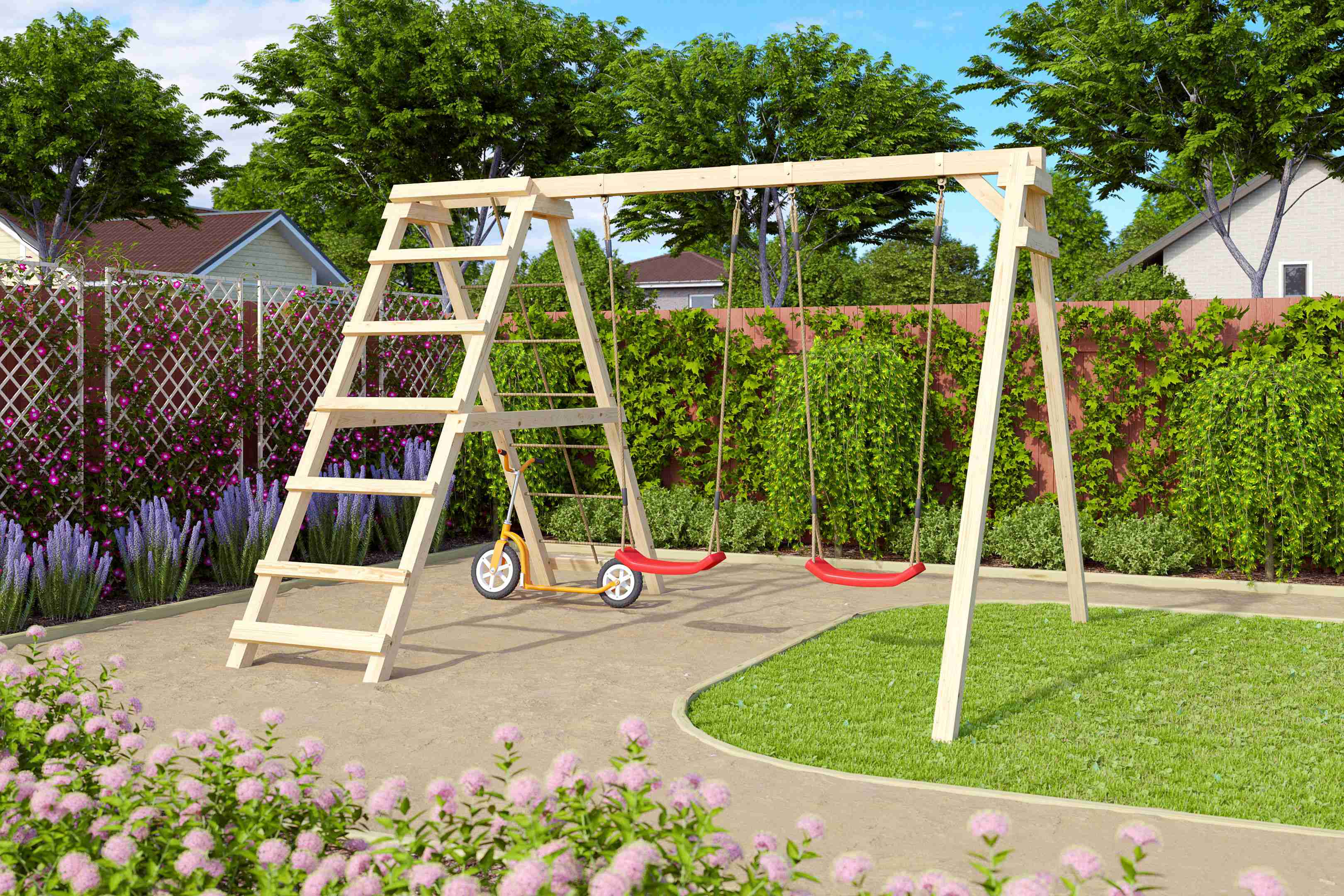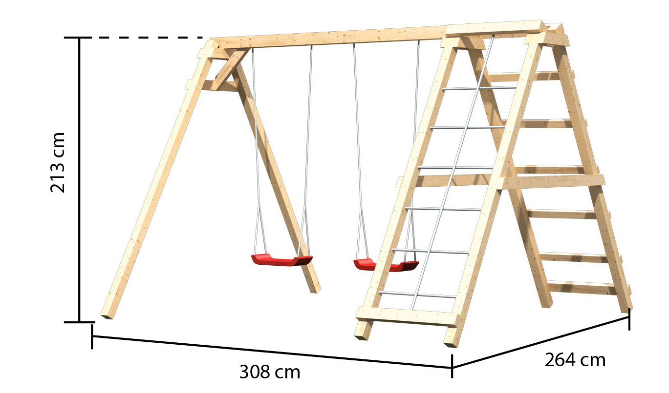 Naše krásná a velmi stabilní dvousedadlová houpačka KARIBU FELIX s lezeckým žebříkem z jedné strany a provazovou rampou z druhé strany je vyrobena z vysoce kvalitních materiálů, a proto je extrémně trvanlivá. Základní konstrukce sloupů z masivního dřeva o tloušťce 68 x 68 mm je vyrobena z přírodního smrkového dřeva. Horní příčník je vyroben ze silnějšího trámu 90 x 90 mm. Pro větší stabilitu jsou na každé straně sloupku nahoře 2 další zesilující vzpěry. Houpací háky i červená houpací sedačka jsou obsahem balení. Samozřejmě máme certifikát TÜV-Nord pro testovanou bezpečnost (GS) dle DIN EN 71-1, DIN EN 71-3, DIN EN 71-8 a AfPS GS 2014. Všechny potřebné šrouby a hřebíky jsou obsahem dodávky (kromě upevňovacích kotev k zemi). Dodáváme jako stavebnici v rozloženém stavu.