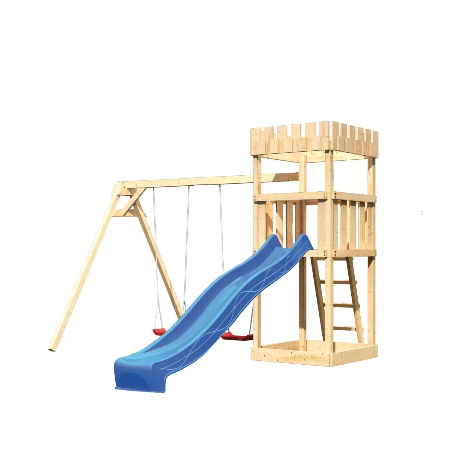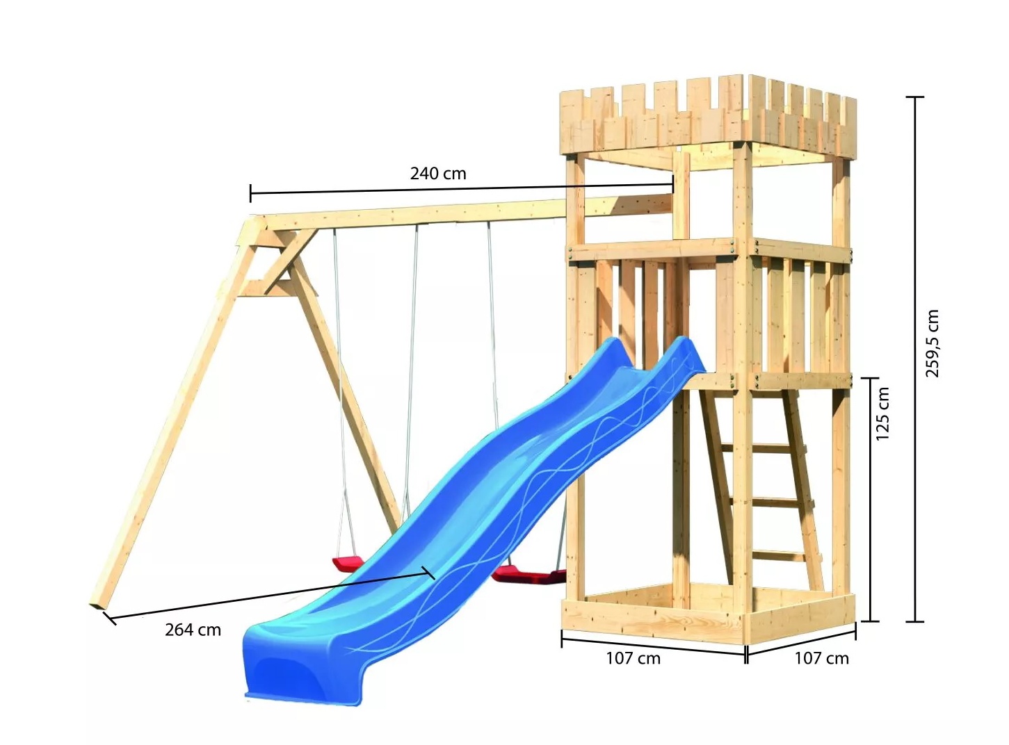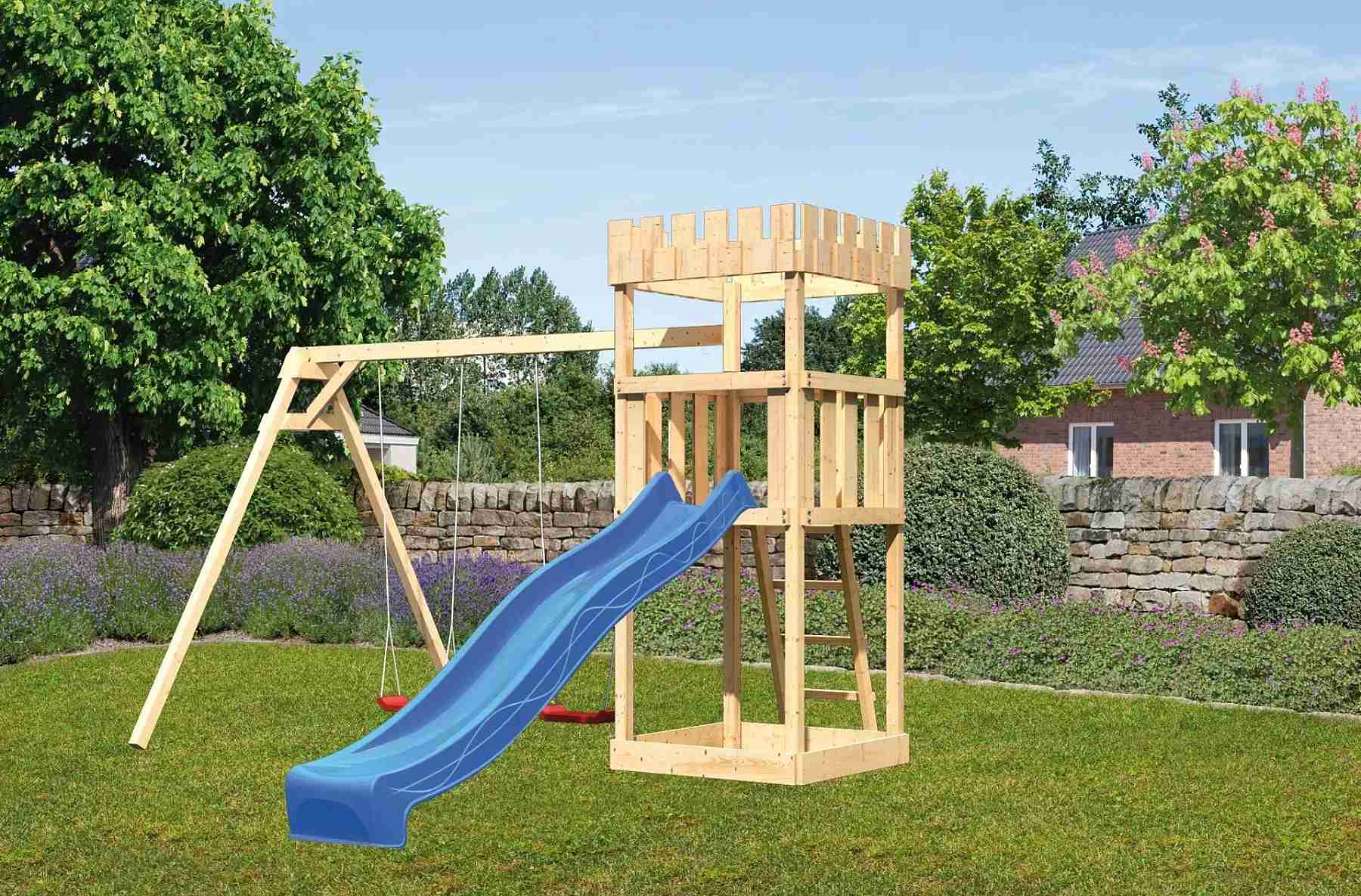 Dětské hřiště KARIBU LÖWENHERZ poskytuje dětem spoustu možností ke hrám. Nabízí vše k tomu, aby děti mohly prožít veškeré své hrací fantazie. Stejně jako u všech našich dětských hřišť i u modelu KARIBU LÖWENHERZ používáme výhradně to nejlepší smrkové dřevo. Hřiště má nosné sloupy o tloušťce 68 x 68 mm a je vyrobené z dřevěných profilů o síle 18 mm (spoje v systému pero / drážka). Naše dřevo pochází ze vzdáleného severu Evropy a je chemicky naprosto neošetřené. V důsledku toho je prosté všech známých problematických látek. Díky výšce plošiny 125 cm nabízí hřiště KARIBU LÖWENHERZ dětem dokonalý výhled na zahradu. Hřiště je standardně vybaveno robustním dřevěným žebříkem se 4 příčkami a pískovištěm pod věží. Dětské hřiště KARIBU LÖWENHERZ má samozřejmě certifikát TÜV Nord ověřující bezpečnost výrobku (GS) podle DIN EN 71-1, DIN EN 71-3, DIN EN 71-8 a AfPS GS 2014.