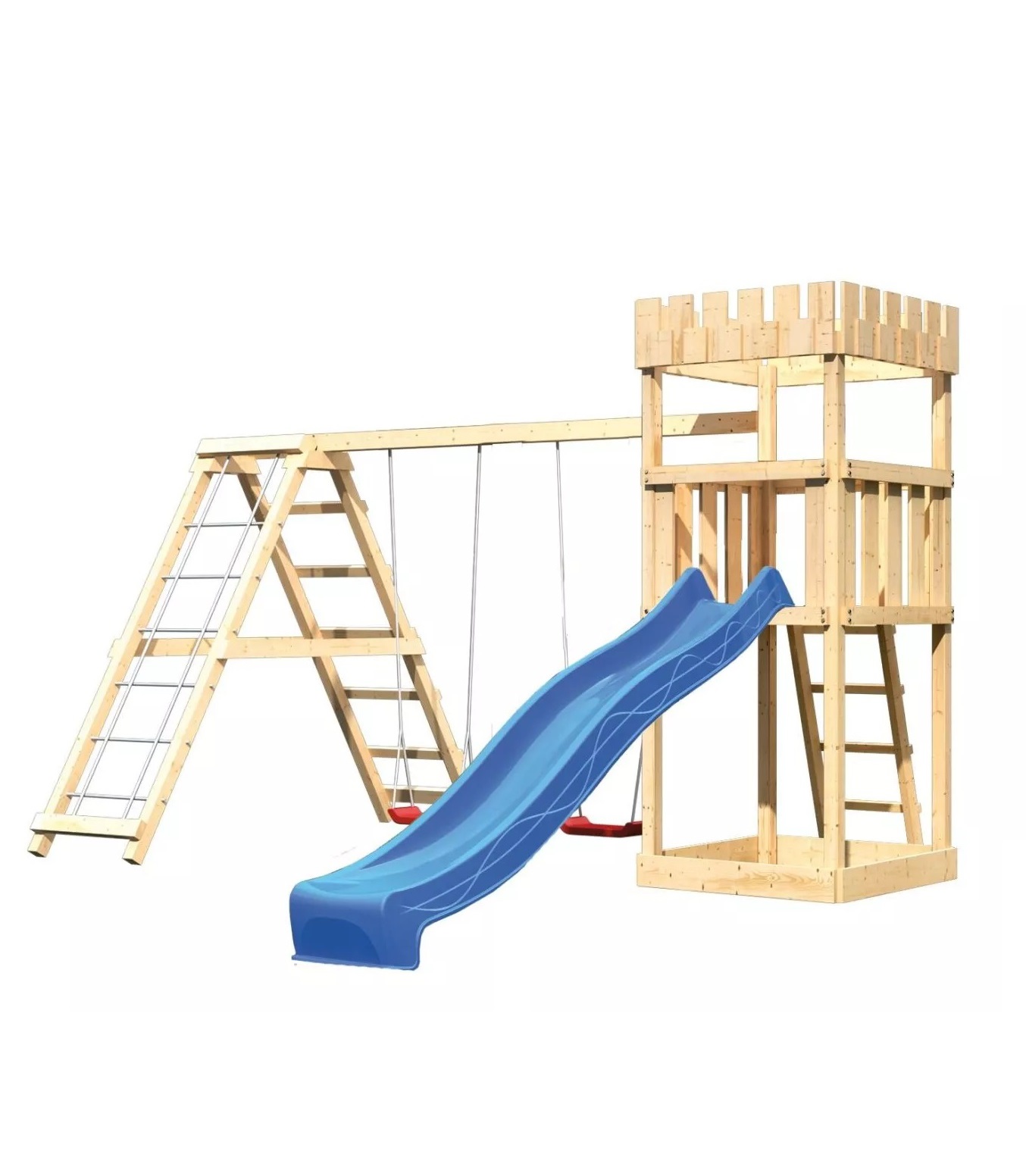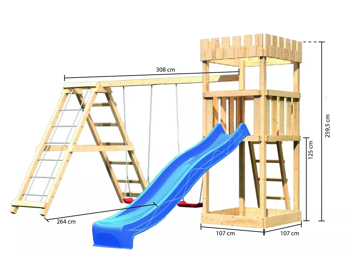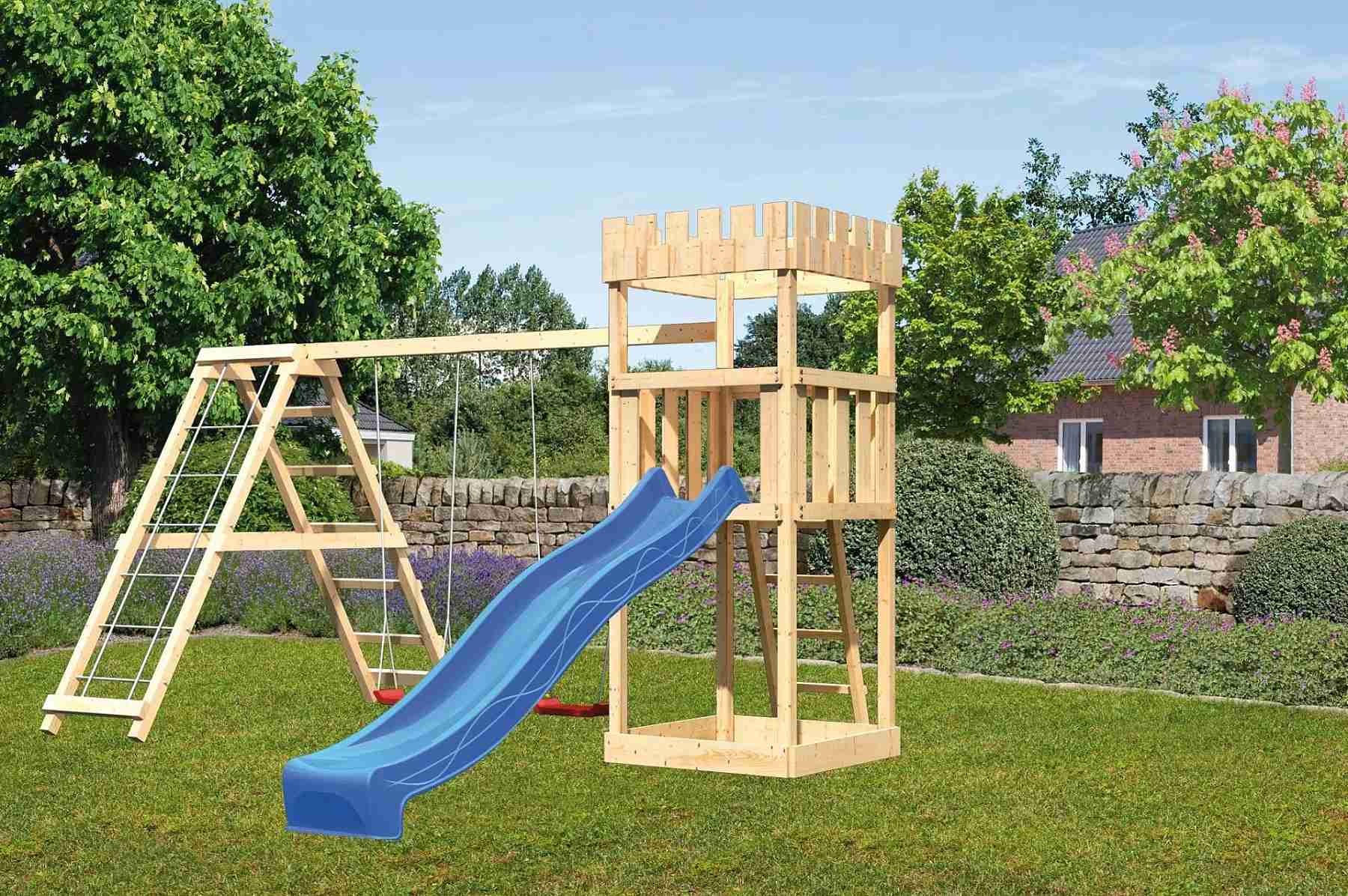 Dětské hřiště KARIBU LÖWENHERZ poskytuje dětem spoustu možností ke hrám. Nabízí vše k tomu, aby děti mohly prožít veškeré své hrací fantazie. Stejně jako u všech našich dětských hřišť i u modelu KARIBU LÖWENHERZ používáme výhradně to nejlepší smrkové dřevo. Hřiště má nosné sloupy o tloušťce 68 x 68 mm a je vyrobené z dřevěných profilů o síle 18 mm (spoje v systému pero / drážka). Naše dřevo pochází ze vzdáleného severu Evropy a je chemicky naprosto neošetřené. V důsledku toho je prosté všech známých problematických látek. Díky výšce plošiny 125 cm nabízí hřiště KARIBU LÖWENHERZ dětem dokonalý výhled na zahradu. Hřiště je standardně vybaveno robustním dřevěným žebříkem se 4 příčkami a pískovištěm pod věží. Dětské hřiště KARIBU LÖWENHERZ má samozřejmě certifikát TÜV Nord ověřující bezpečnost výrobku (GS) podle DIN EN 71-1, DIN EN 71-3, DIN EN 71-8 a AfPS GS 2014.