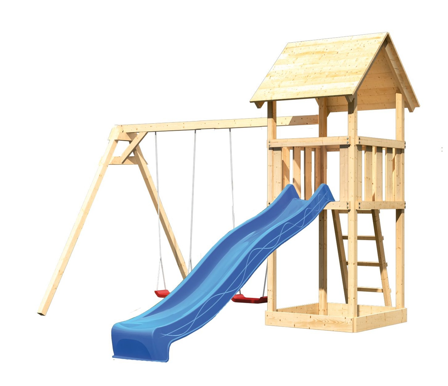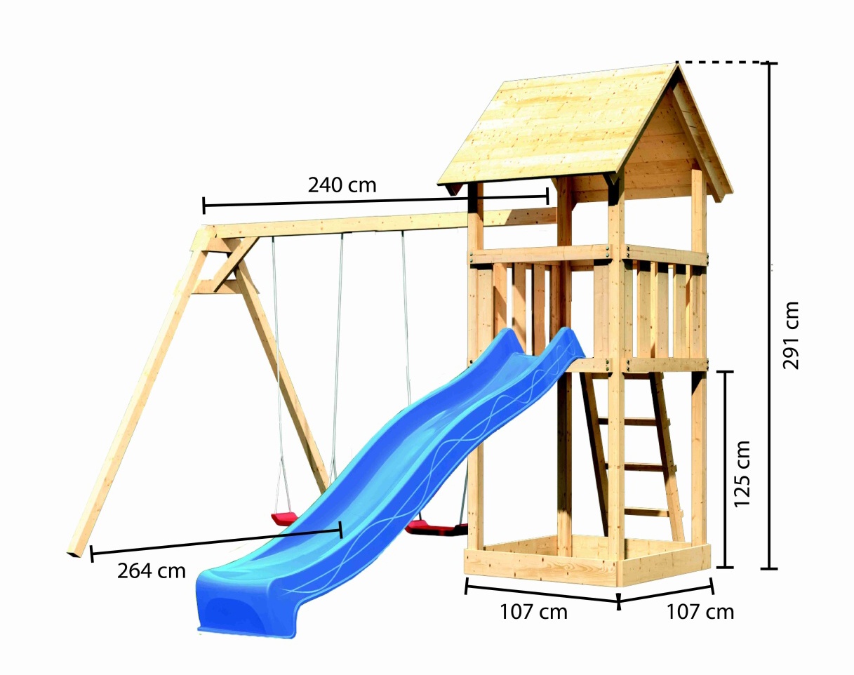 Dětské hřiště KARIBU LOTTI poskytuje dětem spoustu možností ke hrám. Nabízí vše k tomu, aby děti mohly prožít veškeré své hrací fantazie. Stejně jako u všech našich dětských hřišť i u modelu KARIBU LOTTI používáme výhradně to nejlepší smrkové dřevo. Hřiště má nosné sloupy o tloušťce 68 x 68 mm a je vyrobené z dřevěných profilů o síle 18 mm (spoje v systému pero / drážka). Naše dřevo pochází ze vzdáleného severu Evropy a je chemicky naprosto neošetřené. V důsledku toho je prosté všech známých problematických látek. Díky výšce plošiny 125 cm nabízí hřiště KARIBU LOTTI dětem dokonalý výhled na zahradu. Hřiště je standardně vybaveno robustním dřevěným žebříkem se 4 příčkami a pískovištěm pod věží. Dětské hřiště KARIBU LOTTI má samozřejmě certifikát TÜV Nord ověřující bezpečnost výrobku (GS) podle DIN EN 71-1, DIN EN 71-3, DIN EN 71-8 a AfPS GS 2014.