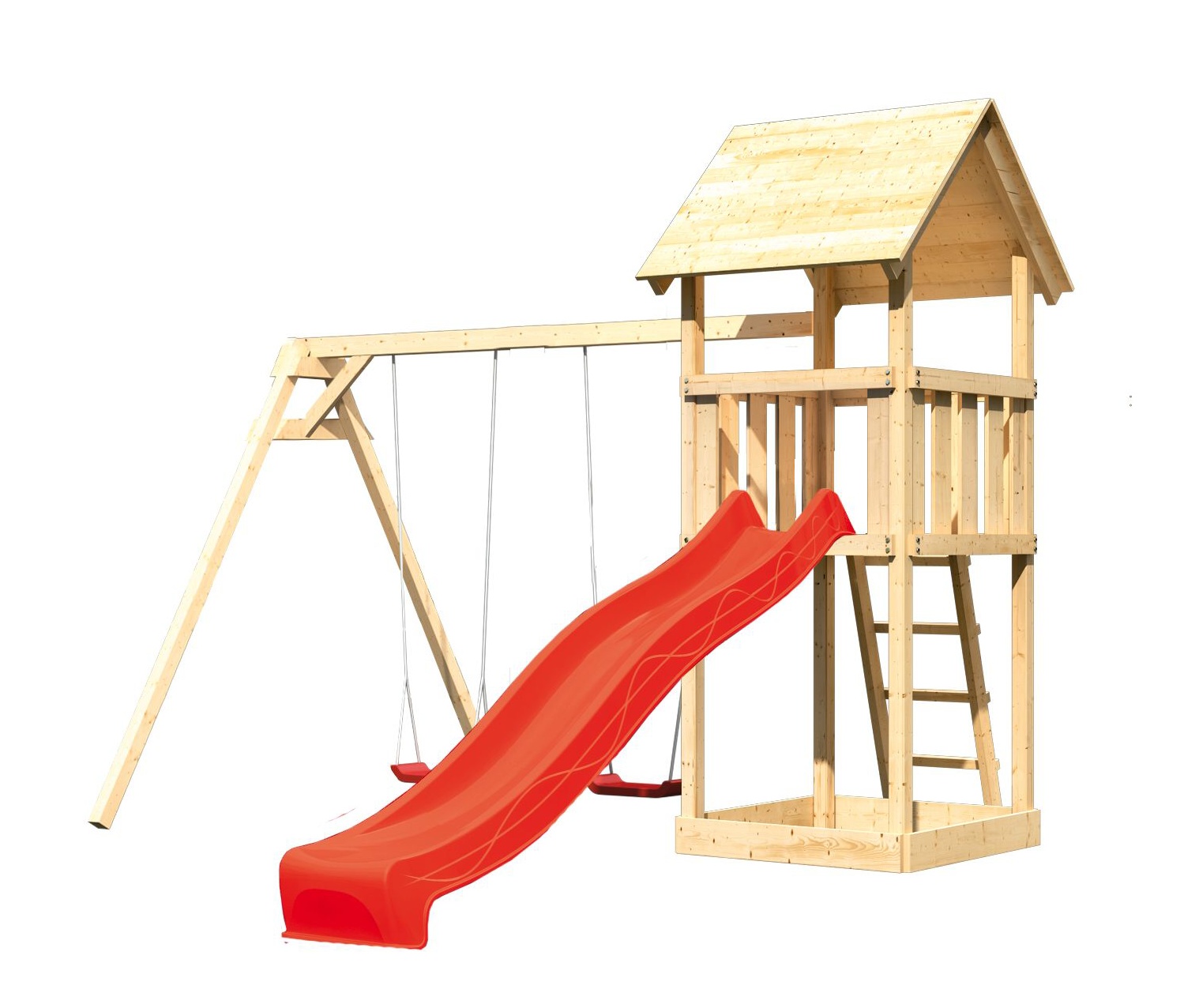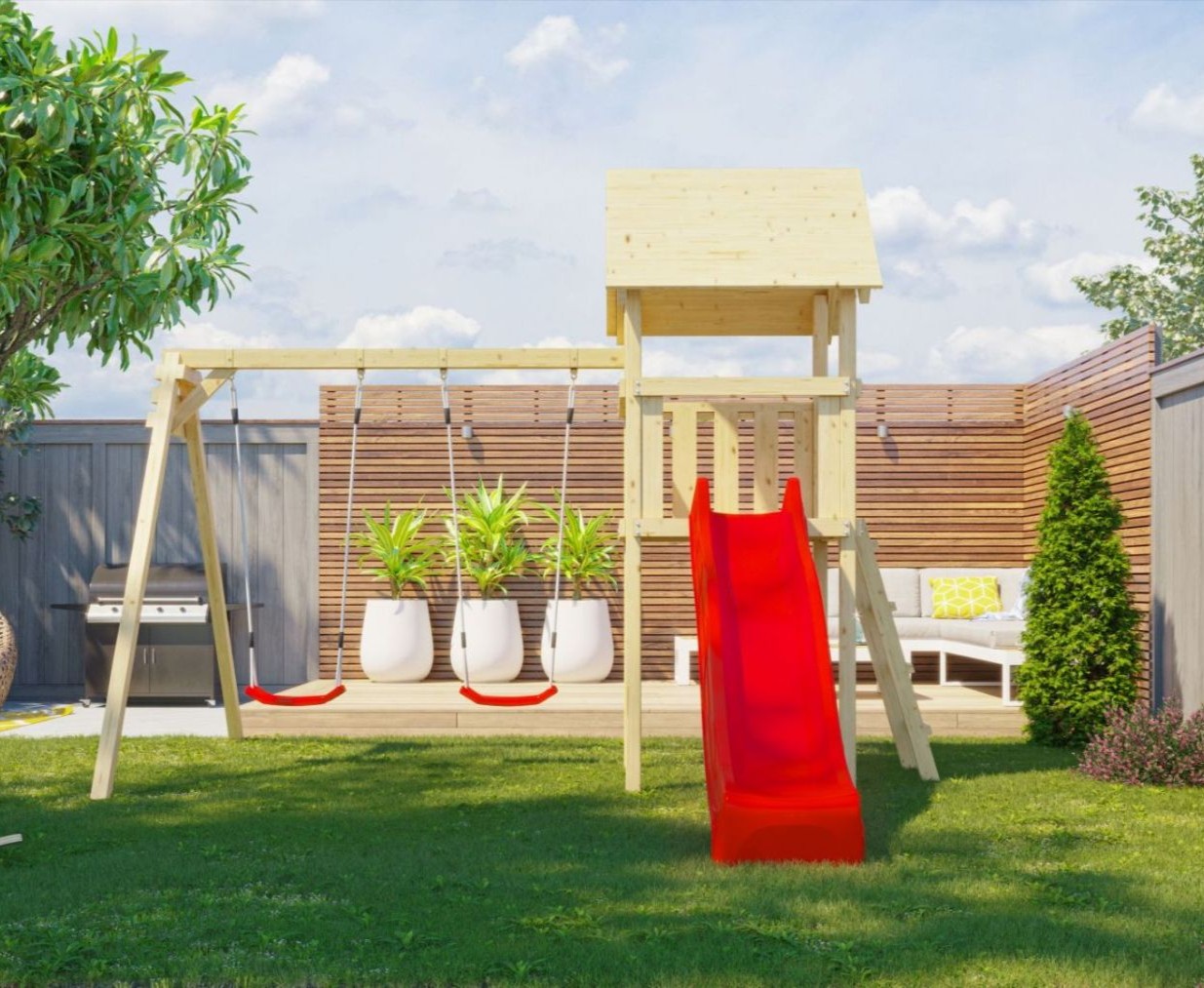 - dvousedadlová houpačka včetně závěsů a dvou červených sedátek