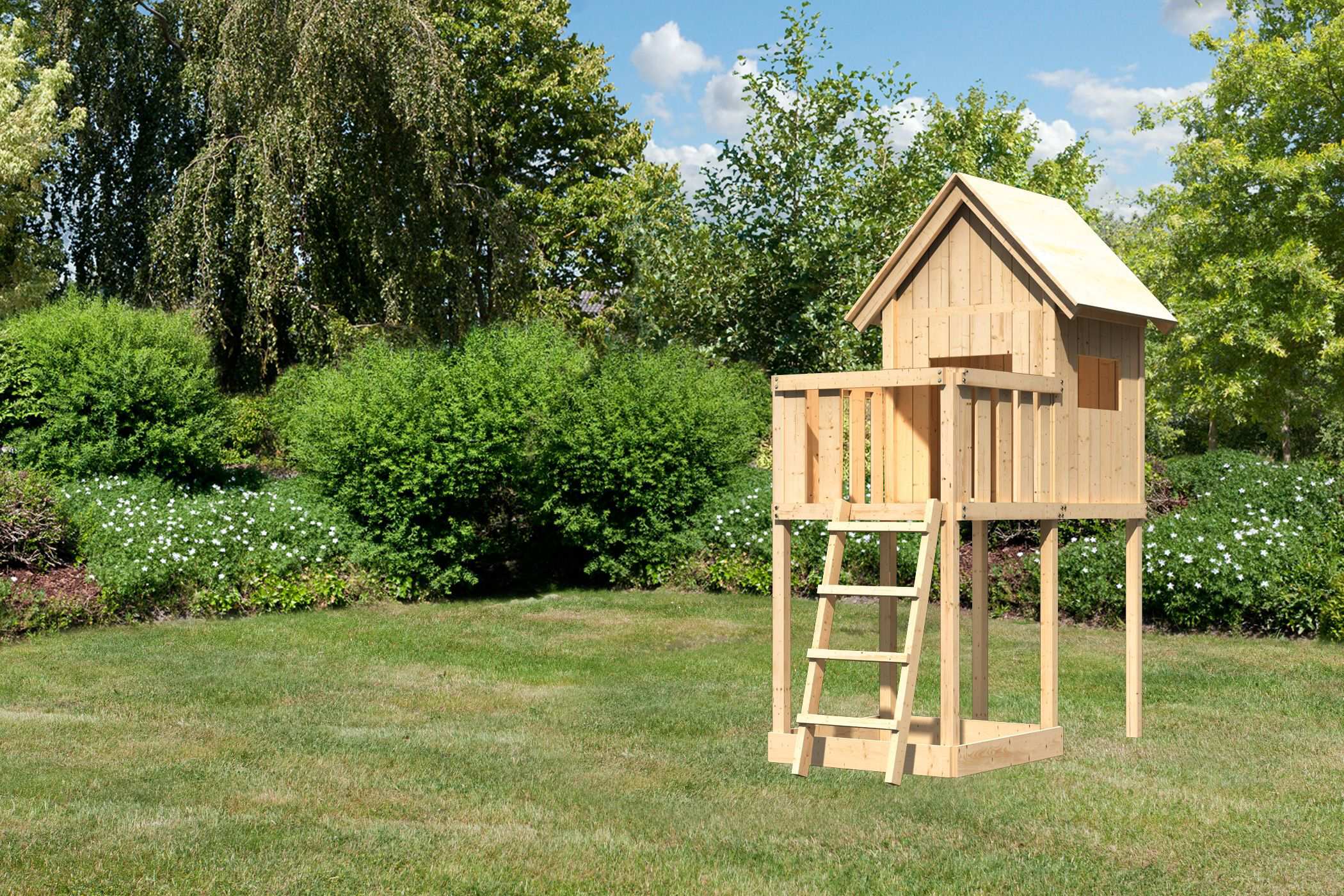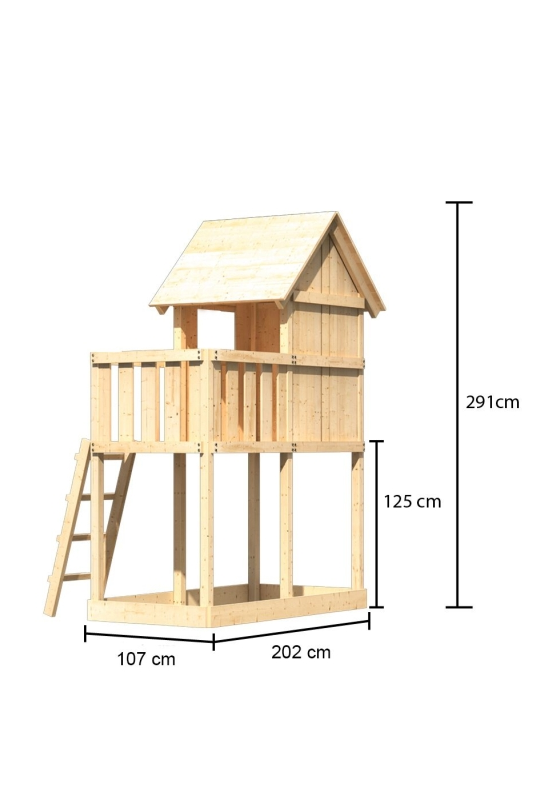 Dětské hřiště KARIBU FRIEDA poskytuje dětem spoustu možností ke hrám. Nabízí vše k tomu, aby děti mohly prožít veškeré své hrací fantazie. Stejně jako u všech našich dětských hřišť i u modelu KARIBU FRIEDA používáme výhradně to nejlepší přírodní smrkové dřevo. Hřiště má nosné sloupy o tloušťce 68 x 68 mm, stěny a podlahu z dřevěných profilů o síle 18 mm (systém pero / drážka). Terasa s domkem se nachází ve výšce 125 cm. Naše dřevo pochází ze vzdáleného severu Evropy a je chemicky naprosto neošetřené. V důsledku toho je prosté všech známých problematických látek. Díky výšce plošiny nabízí hřiště KARIBU FRIEDA dětem dokonalý výhled na zahradu. Sedlová střecha je vyrobena z dřevotřískových desek. Hřiště je standardně vybaveno robustním dřevěným žebříkem se 4 příčkami a pískovištěm pod věží. I tento výrobek má samozřejmě certifikát TÜV Nord ověřující bezpečnost výrobku (GS) podle DIN EN 71-1, DIN EN 71-3, DIN EN 71-8 a AfPS GS 2014.