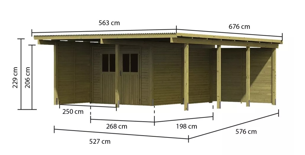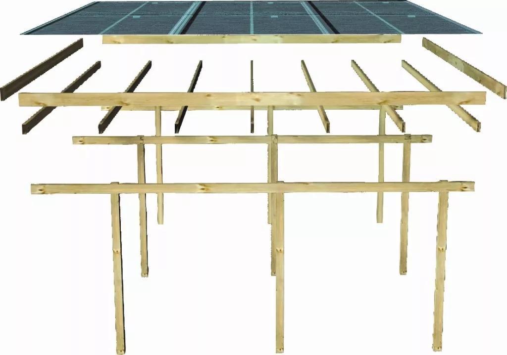 Přístřešek má obdélníkový tvar a svými rozměry vyhovuje většině modelů vozidel běžných na českém trhu. Celková zastřešená plocha je 5,63 x 6,76 m. Průjezdná výška je 206 cm. Střechu podpírá dvanáct dřevěných sloupků 9 x 9 cm. Konstrukce přístřešku je tlakově impregnována a je tak dobře chráněna proti dřevokazným houbám i hmyzu, ale i proti nepříznivým povětrnostním podmínkám. Impregnace je zdravotně nezávadná a naprosto bezpečná. Vzhledem k velkým plochám střechy a zatížení větrem je nutné připevnit přístřešek k zemi pomocí odpovídajících zemních kotev (nejsou obsahem dodávky - lze dokoupit jako příplatkové příslušenství).