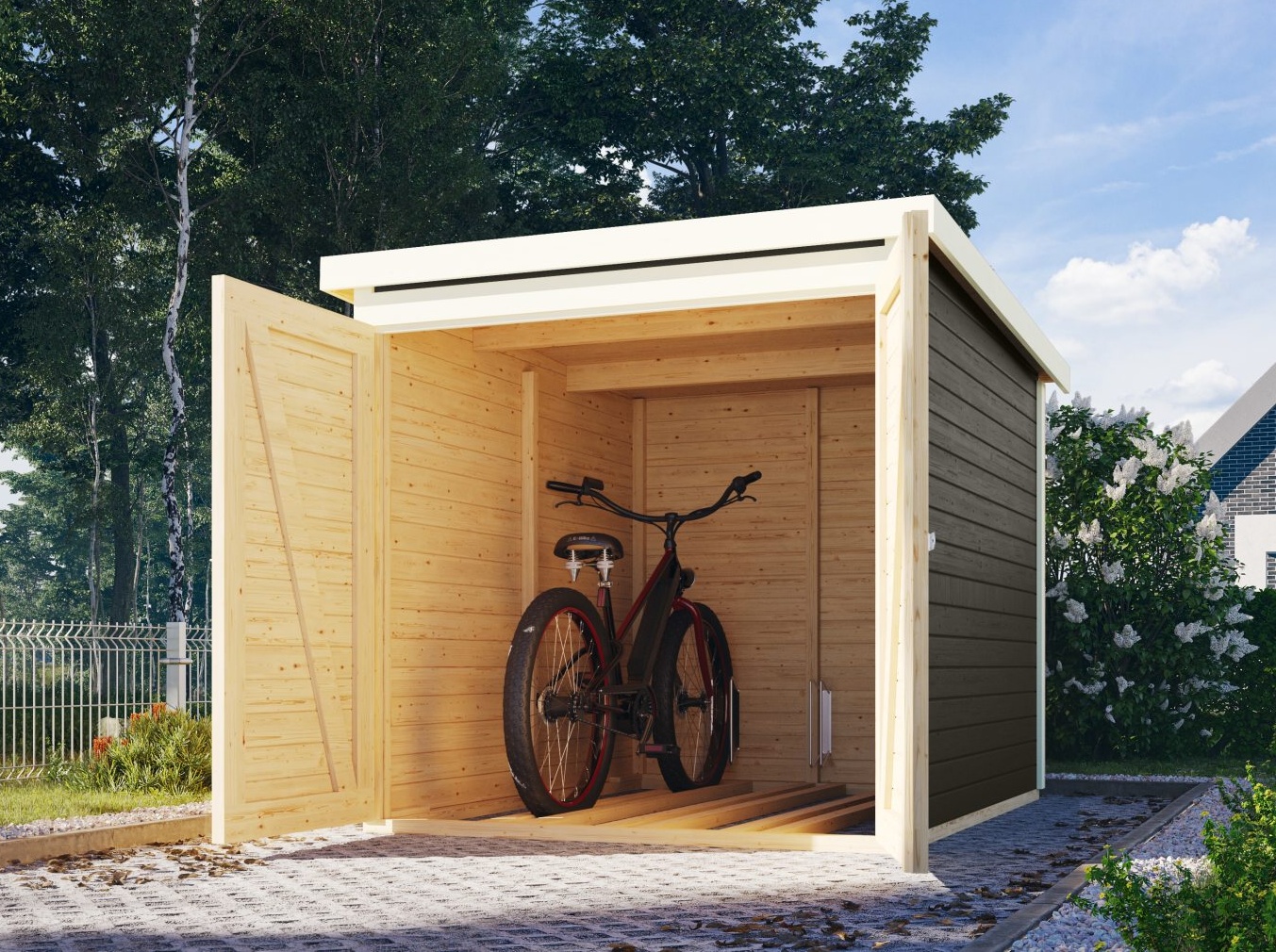 Garáž pro 3 jízdní kola. Tento model má pultovou střechu a dvoukřídlé dveře na pantech. Stavebním materiálem garáže jsou dřevěné profily síly 19 mm perfektně vyfrézované ze severského smrku. Dodáváme jako stavebnici v rozloženém stavu, kde stěny tvoří jednotlivé dřevěné profily, které pouze sesadíte k sobě a sešroubujete, střechu tvoří celistvá deska. To garantuje extrémně jednoduchou montáž, kterou zvládne každý český kutil. Garáž na kola navíc obsahuje police a držáky na pneumatiky kol.