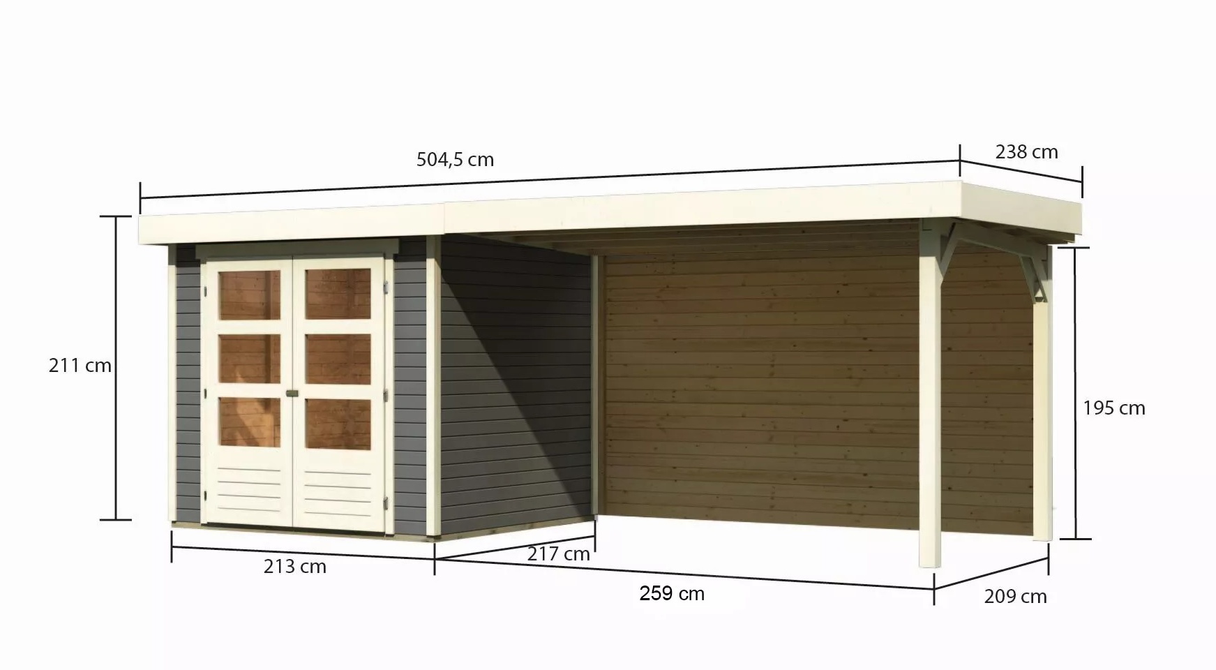 Tato verze domku obsahuje přístavek včetně zadní stěny délky 280 cm montovatelný zprava nebo zleva.