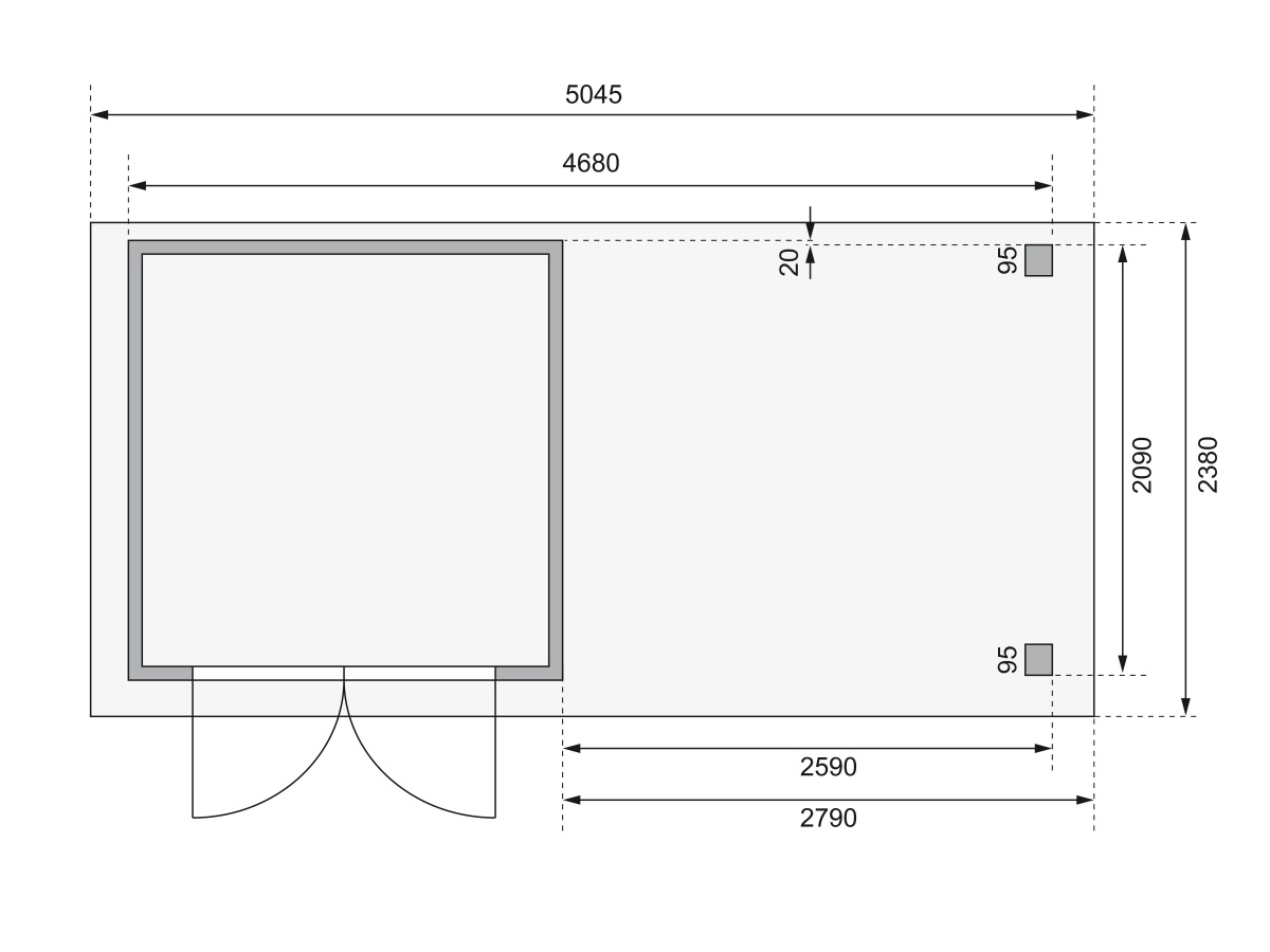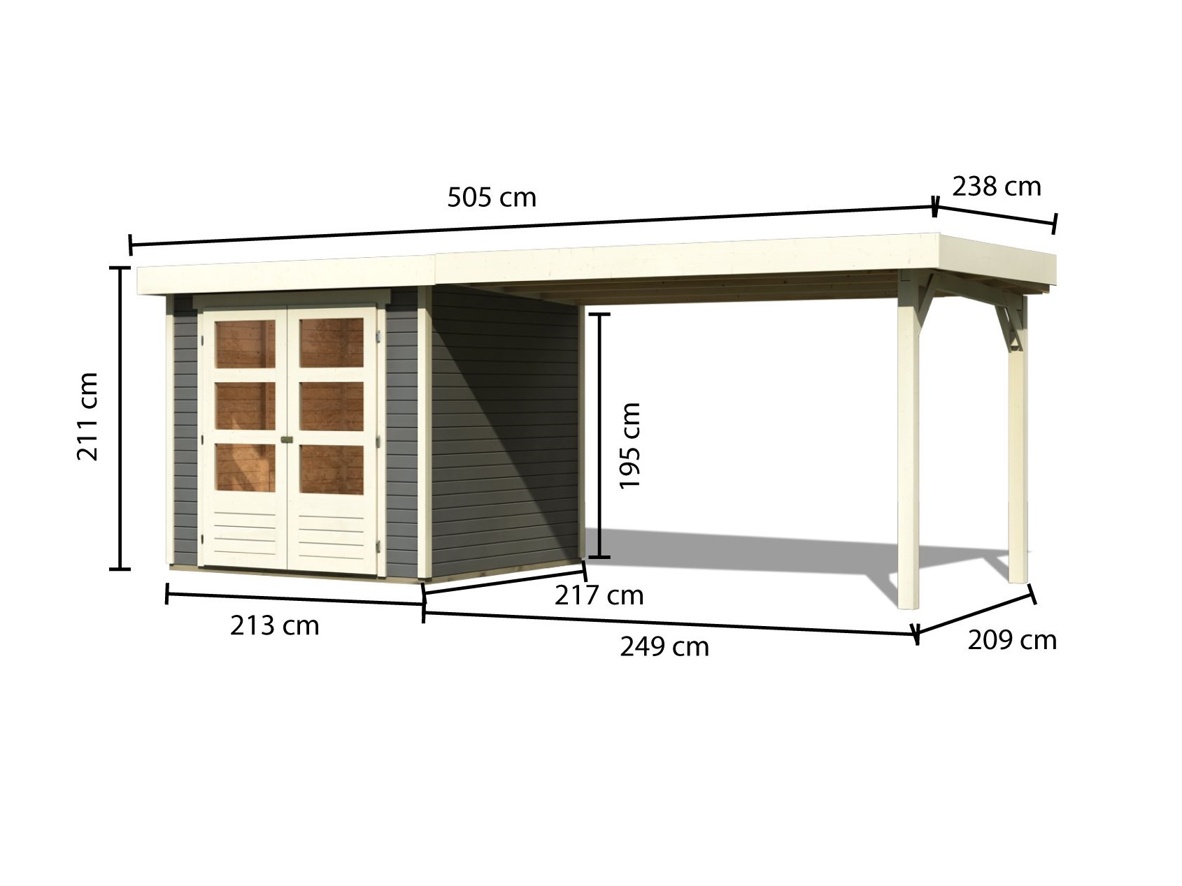 Tato verze domku obsahuje otevřený přístavek délky 280 cm montovatelný zprava nebo zleva.