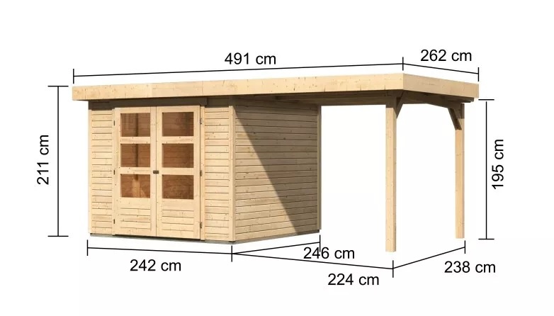 Tato verze domku obsahuje přístavek délky 240 cm montovatelný zprava nebo zleva.