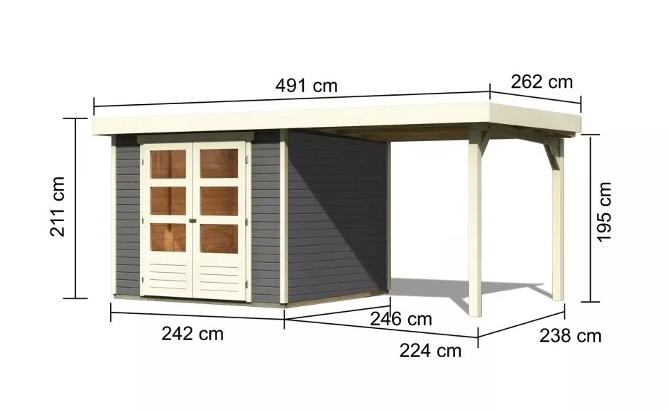 Tato verze domku obsahuje přístavek délky 240 cm montovatelný zprava nebo zleva.