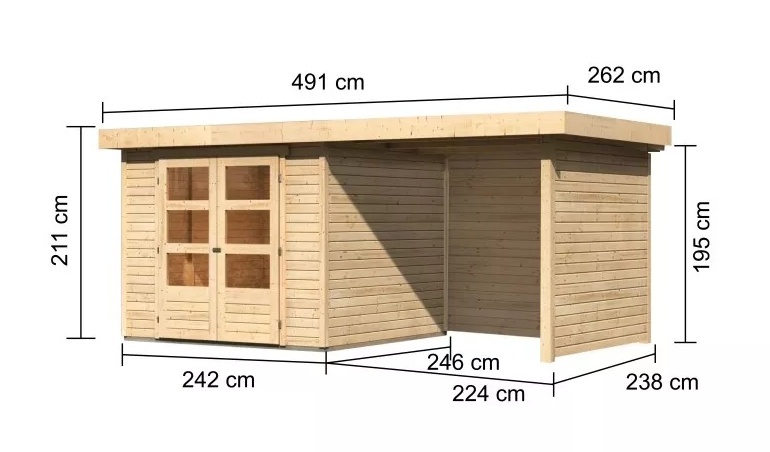 Tato verze domku obsahuje přístavek včetně zadní a boční stěny délky 240 cm montovatelný zprava nebo zleva.