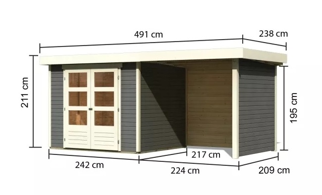 Tato verze domku obsahuje přístavek včetně zadní a boční stěny délky 240 cm montovatelný zprava nebo zleva.