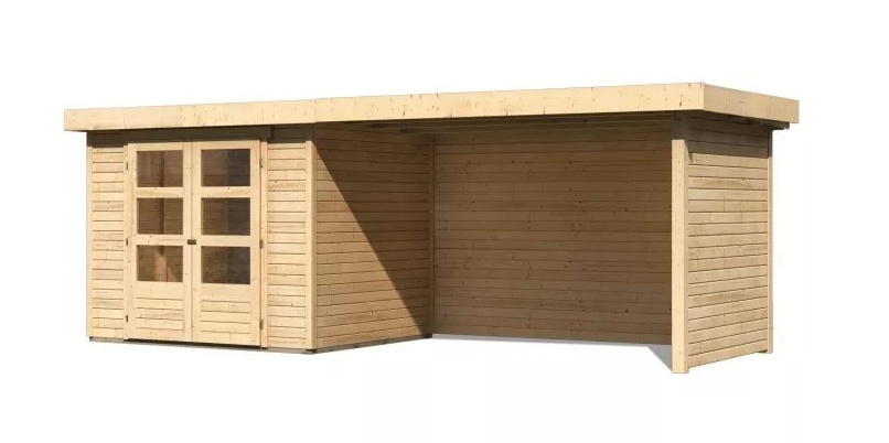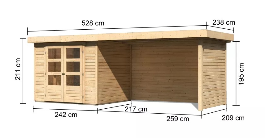 Tato verze domku obsahuje přístavek včetně zadní a boční stěny délky 280 cm montovatelný zprava nebo zleva.