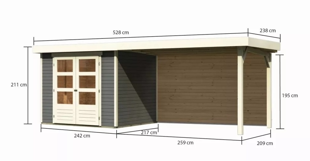 Tato verze domku obsahuje přístavek včetně zadní stěny délky 280 cm montovatelný zprava nebo zleva.