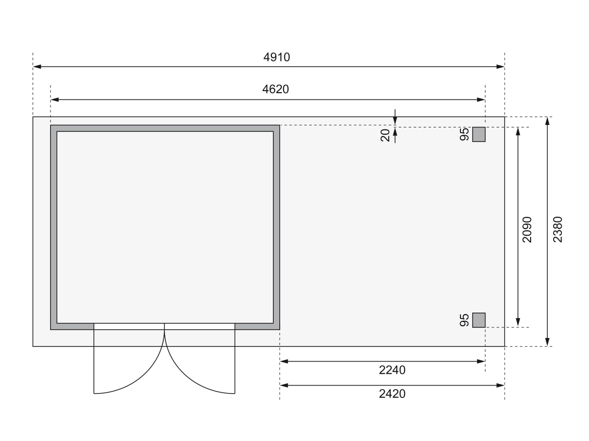 Tato verze domku obsahuje i otevřený přístavek délky 240 cm montovatelný zprava nebo zleva.
