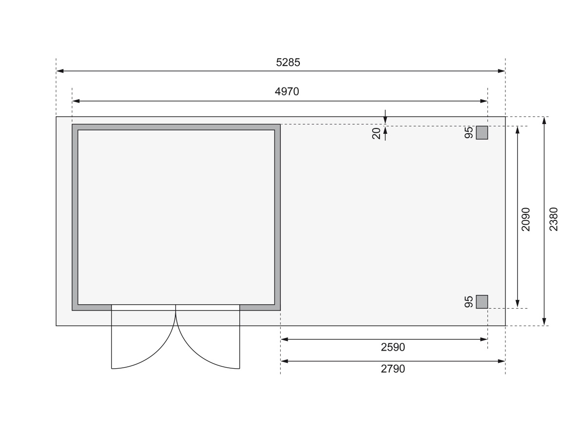 Tato verze domku obsahuje otevřený přístavek délky 280 cm montovatelný zprava nebo zleva.