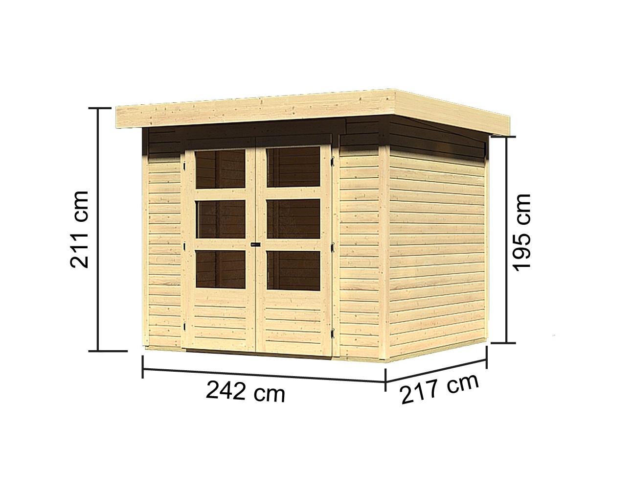 Základní model dřevěného domku pro vaši zahradu. Tento model má pultovou střechu a dvoukřídlé dveře na pantech s oknem v každém křídle. Stavebním materiálem domku jsou dřevěné profily síly 19 mm perfektně vyfrézované ze severského smrku. Dodáváme jako stavebnici v rozloženém stavu, kde stěny tvoří jednotlivé dřevěné profily, které pouze sesadíte k sobě a sešroubujete, střechu tvoří celistvá deska. To garantuje extrémně jednoduchou montáž, kterou zvládne každý český kutil.