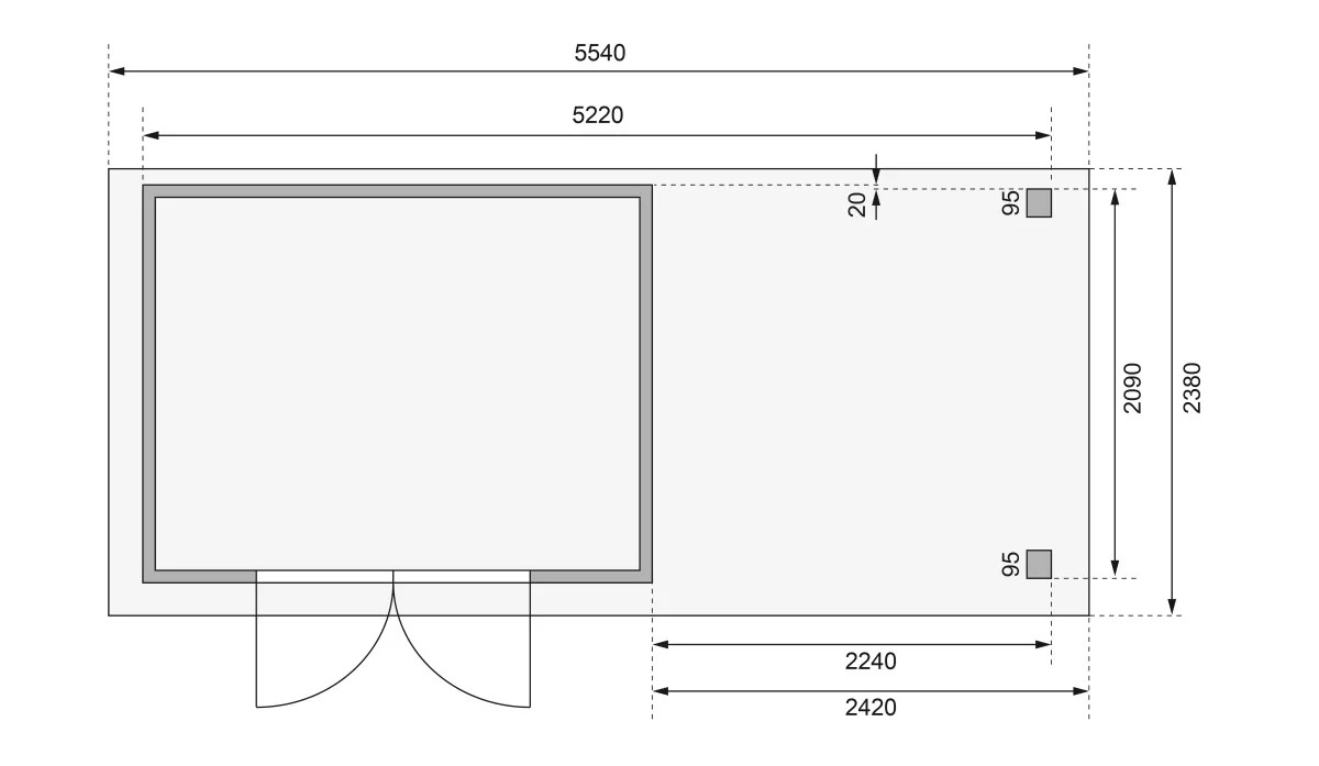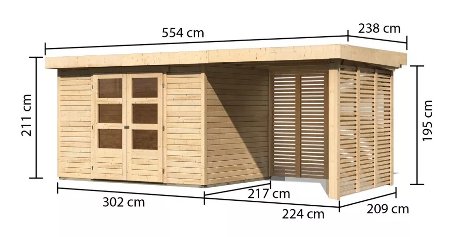Tato verze domku obsahuje lamelový přístavek včetně zadní a boční stěny délky 240 cm montovatelný zprava nebo zleva.