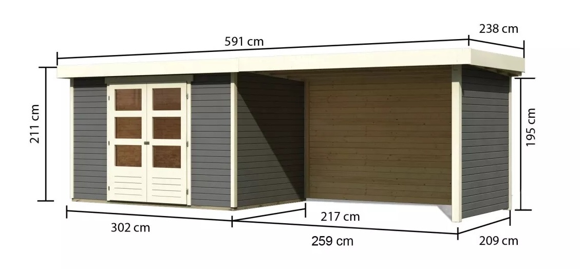 Tato verze domku obsahuje přístavek včetně zadní a boční stěny délky 280 cm montovatelný zprava nebo zleva.