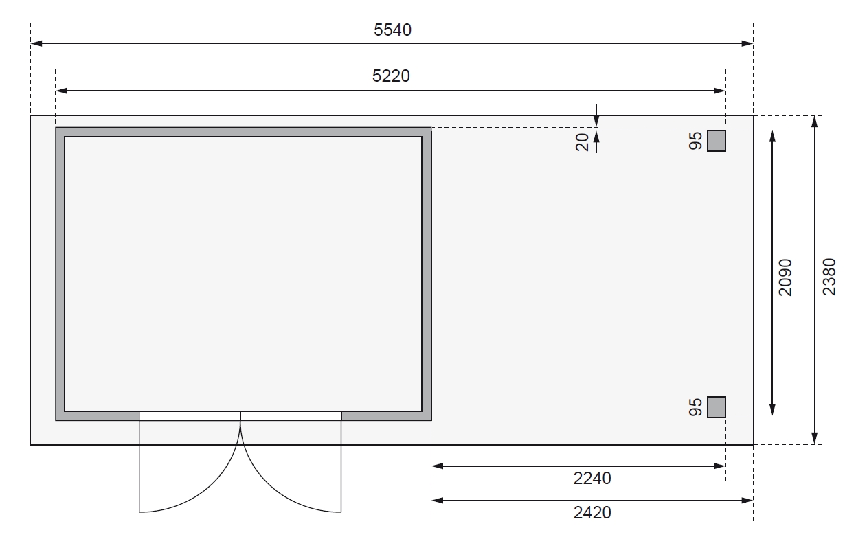 Tato verze domku obsahuje i otevřený přístavek délky 240 cm montovatelný zprava nebo zleva.
