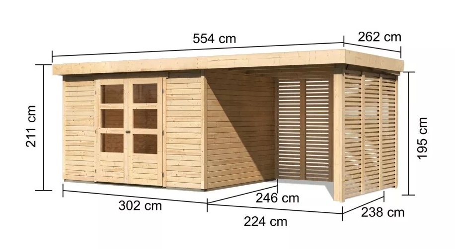 Tato verze domku obsahuje lamelový přístavek včetně zadní a boční stěny délky 240 cm montovatelný zprava nebo zleva.