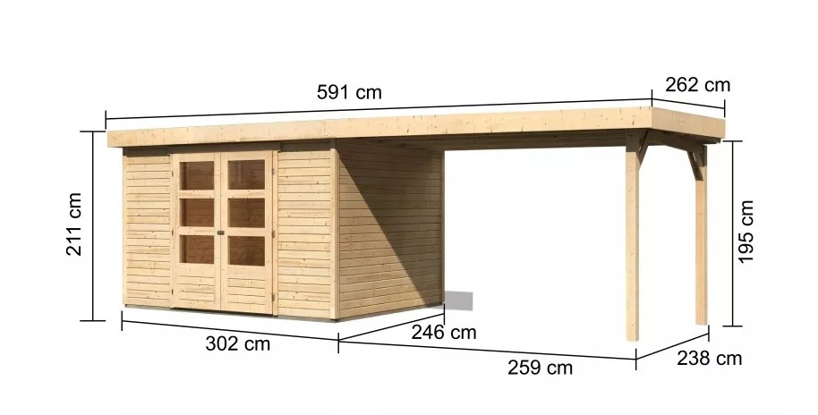 Tato verze domku obsahuje přístavek délky 280 cm montovatelný zprava nebo zleva.