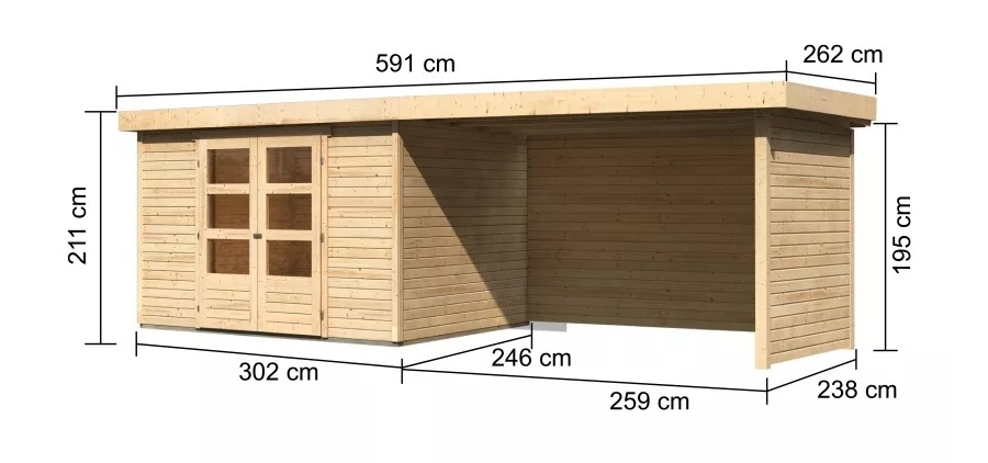 Tato verze domku obsahuje přístavek včetně zadní a boční stěny délky 280 cm montovatelný zprava nebo zleva.