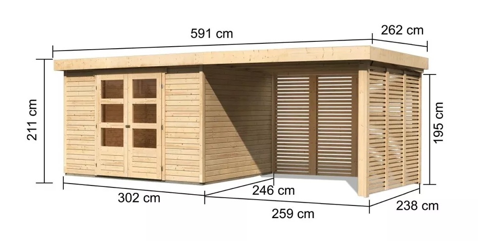 Tato verze domku obsahuje lamelový přístavek včetně zadní a boční stěny délky 280 cm montovatelný zprava nebo zleva.