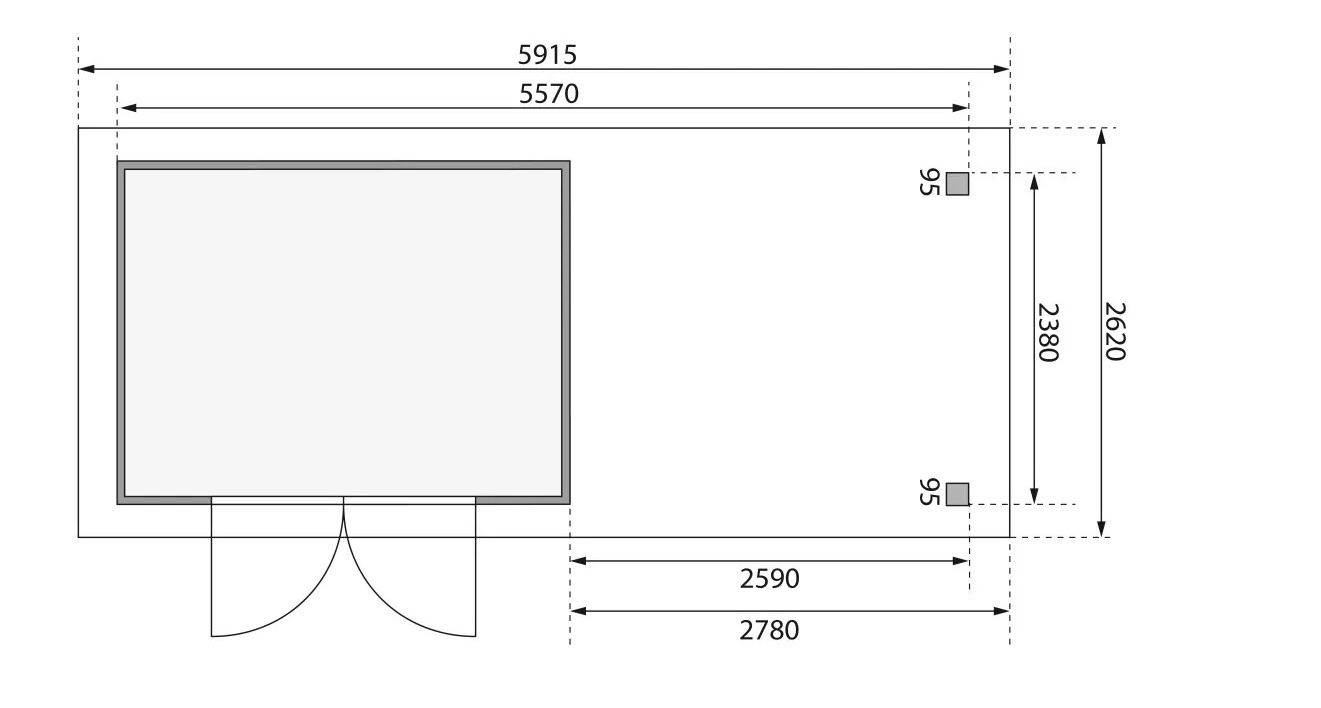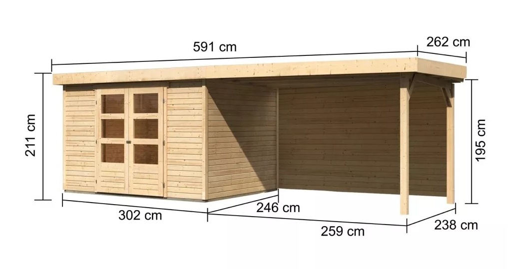 Tato verze domku obsahuje přístavek včetně zadní stěny délky 280 cm montovatelný zprava nebo zleva.