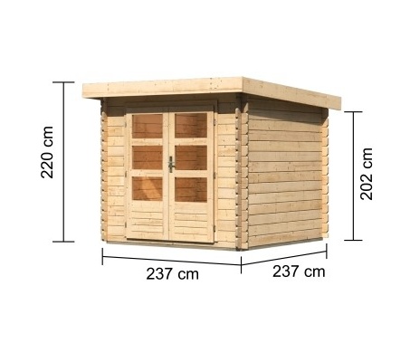Základní model dřevěného domku pro vaši zahradu. Tento model má pultovou střechu a dvoukřídlé dveře na pantech s oknem v každém křídle. Stavebním materiálem domku jsou dřevěné profily síly 28 mm perfektně vyfrézované ze severského smrku. Dodáváme jako stavebnici v rozloženém stavu. Velkou výhodou této řady je patentovaný rohový spoj 6-Plus. Společně tak zajišťují nejen odolnou a stabilní konstrukci ale také robustní celkový vzhled. Střechu tvoří celistvá deska. To garantuje extrémně jednoduchou montáž, kterou zvládne každý český kutil.