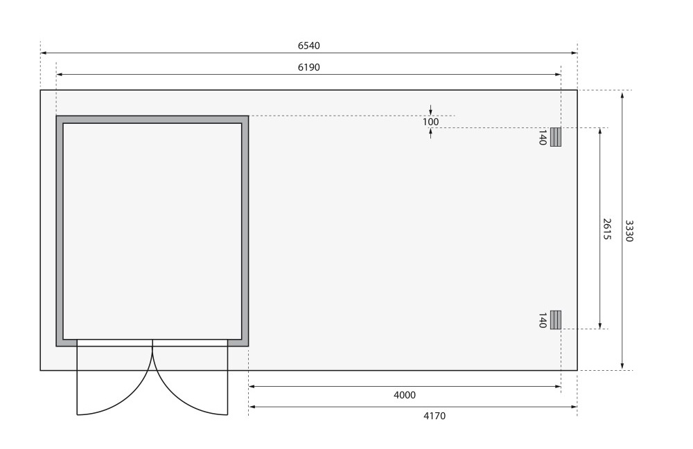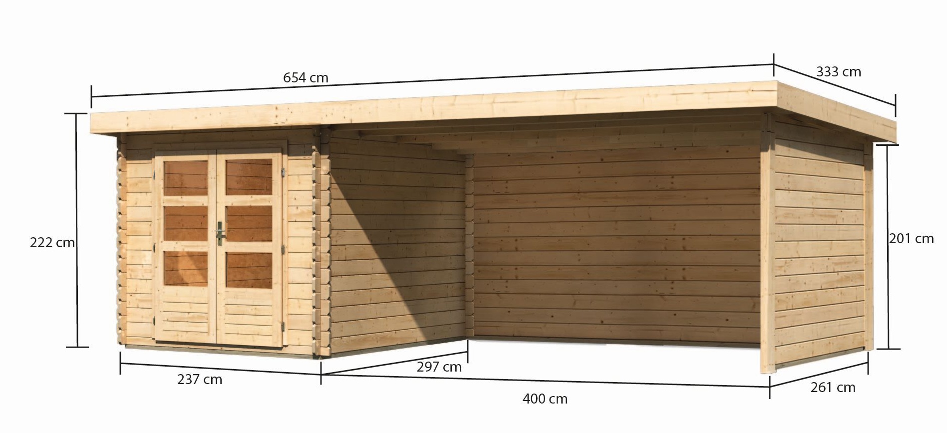 Tato verze domku obsahuje i přístavek včetně zadní a boční stěny délky 400 cm.