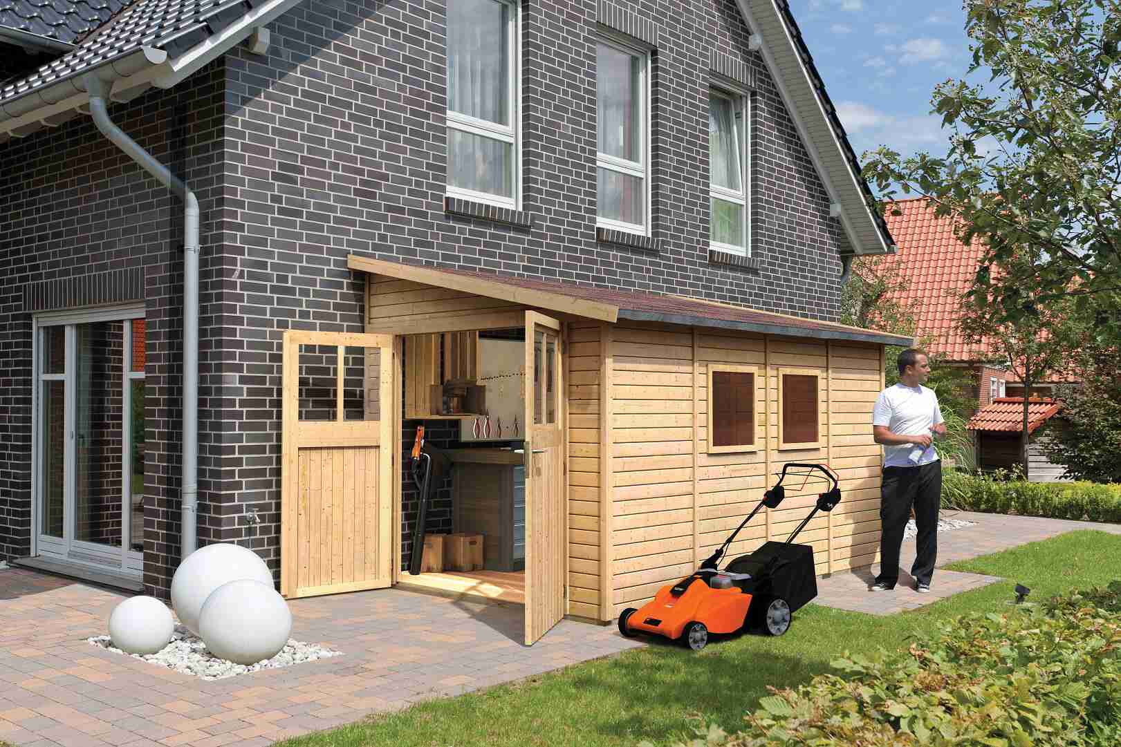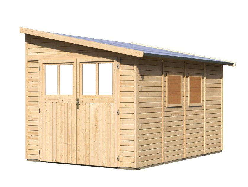 Dřevěný domek ke zdi. V domku můžete uskladnit zahradní techniku, nářadí nebo si v něm vybudovat kutilskou dílnu. Domek má šikmou střechu a jedny dvoukřídlé dveře na pantech s oknem v každém křídle. Stavebním materiálem domku jsou dřevěné profily síly 19 mm perfektně vyfrézované ze severského smrku. Dodáváme jako stavebnici v rozloženém stavu, kde stěny tvoří jednotlivé dřevěné profily, které pouze sesadíte k sobě a sešroubujete, střechu tvoří celistvá deska. To garantuje extrémně jednoduchou montáž, kterou zvládne každý český kutil.