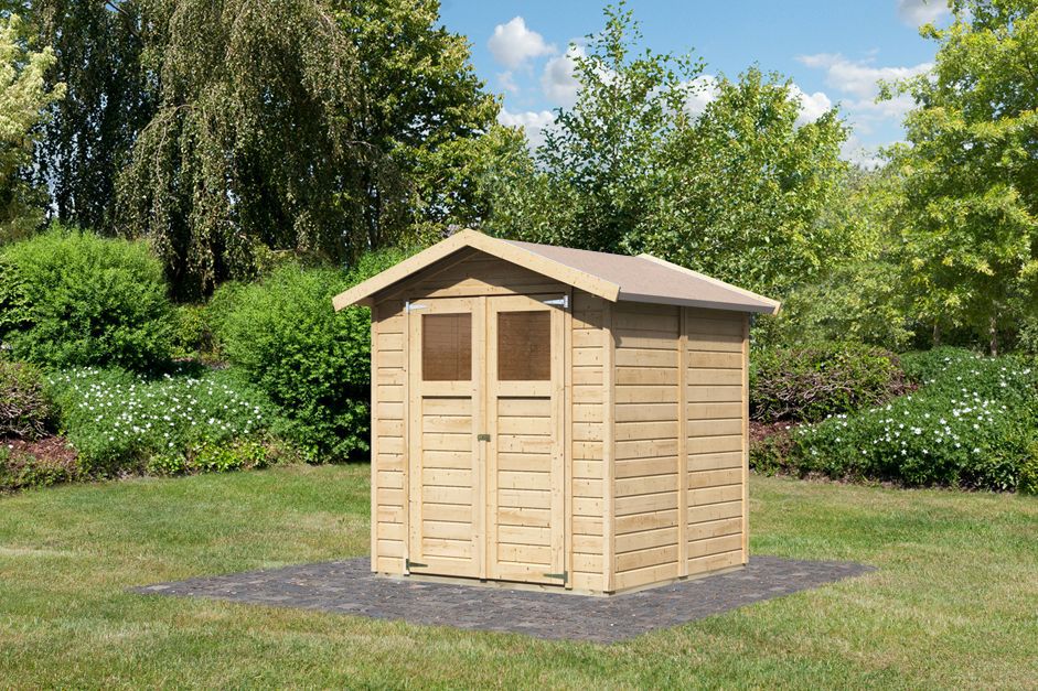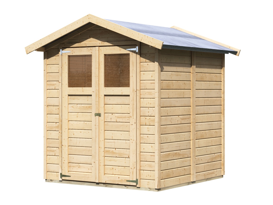 Základní model dřevěného domku pro vaši zahradu. Tento model má sedlovou střechu a dvoukřídlé dveře na pantech s oknem v každém křídle. Stavebním materiálem domku jsou dřevěné profily síly 14 mm perfektně vyfrézované ze severského smrku. Dodáváme jako stavebnici v rozloženém stavu, kde stěny tvoří předpřipravené menší panely, které pouze sešroubujete k sobě a střechu tvoří celistvá deska. To garantuje extrémně jednoduchou montáž, kterou zvládne každý český kutil.
