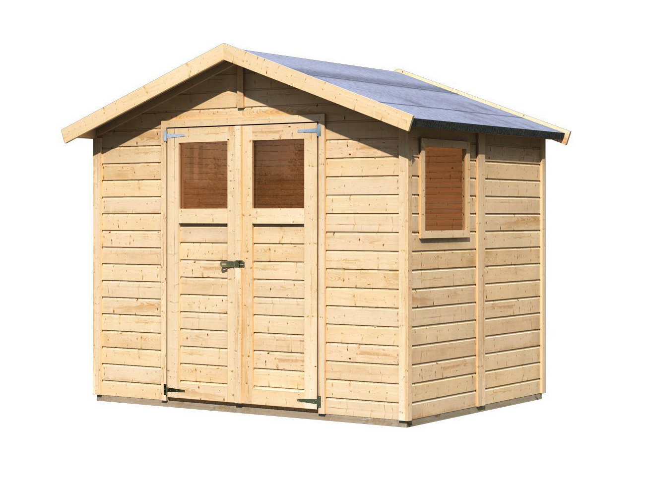 Základní model dřevěného domku pro vaši zahradu. Tento model má sedlovou střechu a dvoukřídlé dveře na pantech s oknem v každém křídle. Stavebním materiálem domku jsou dřevěné profily síly 14 mm perfektně vyfrézované ze severského smrku. Dodáváme jako stavebnici v rozloženém stavu, kde stěny tvoří předpřipravené menší panely, které pouze sešroubujete k sobě a střechu tvoří celistvá deska. To garantuje extrémně jednoduchou montáž, kterou zvládne každý domácí kutil.